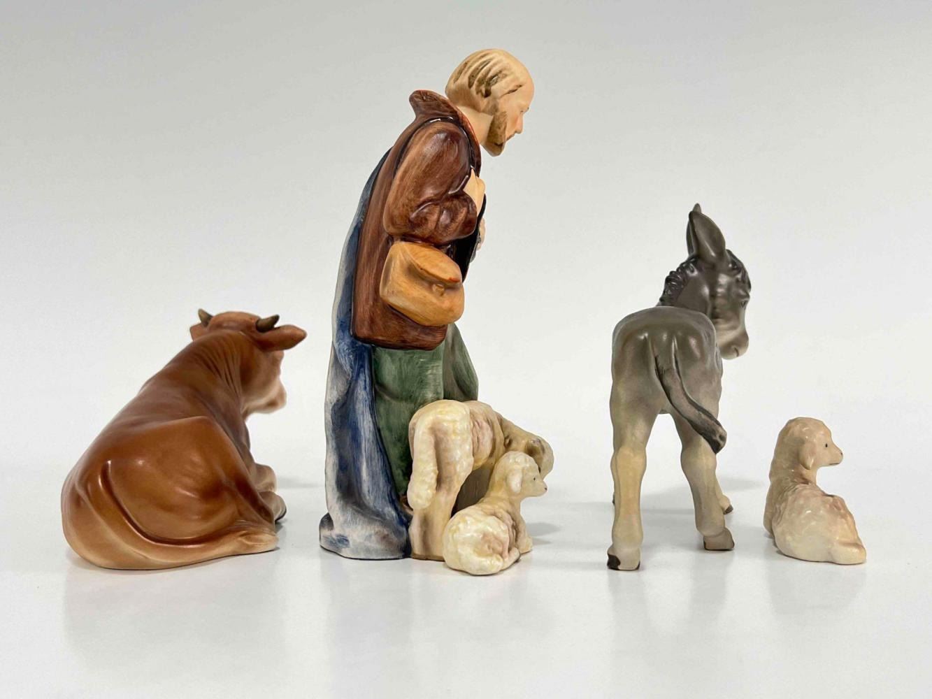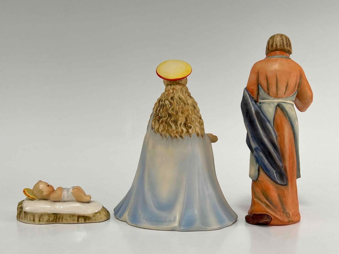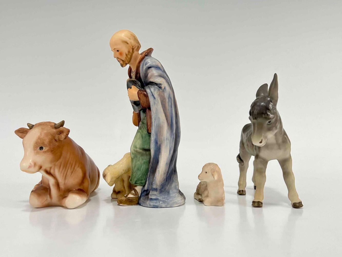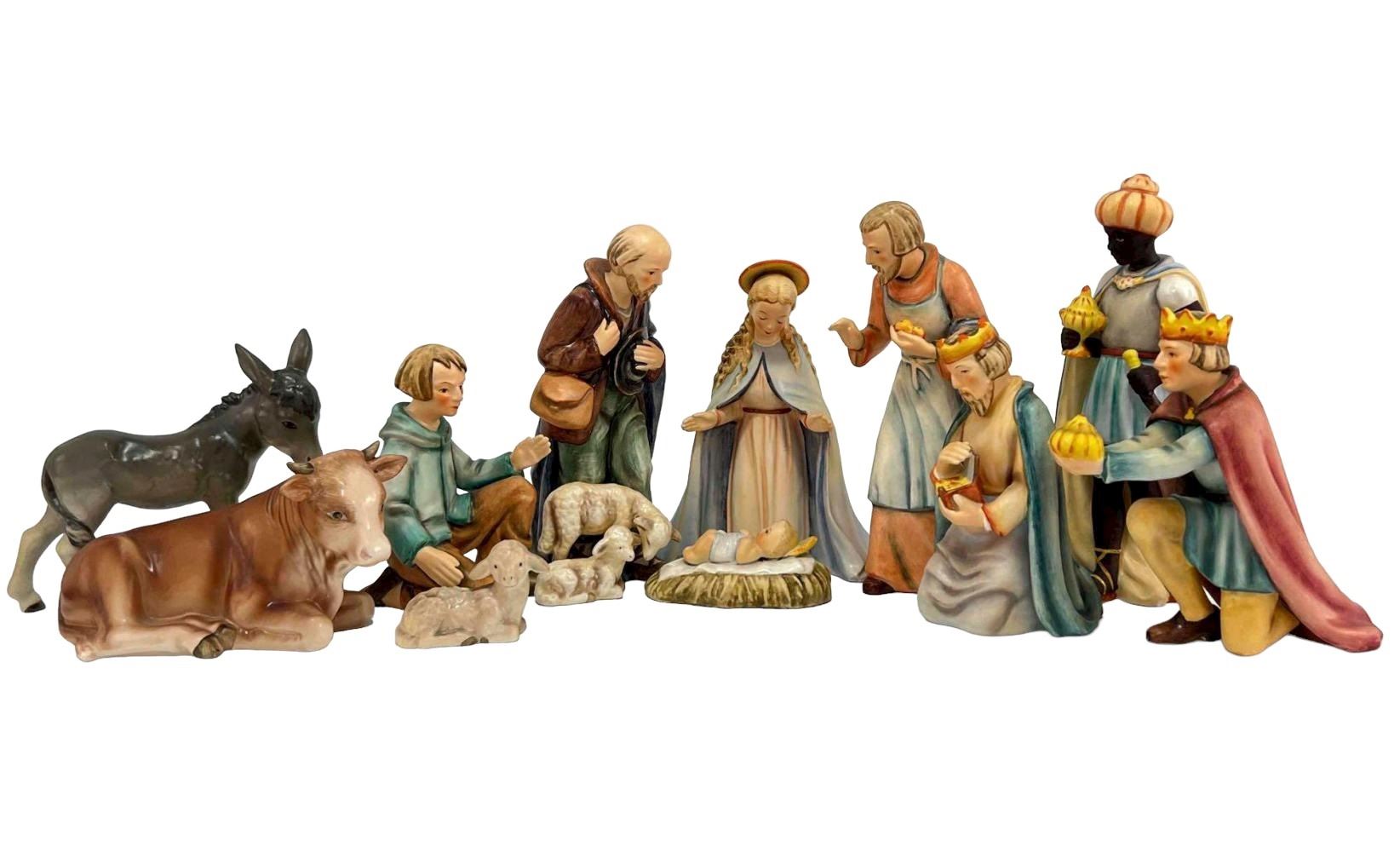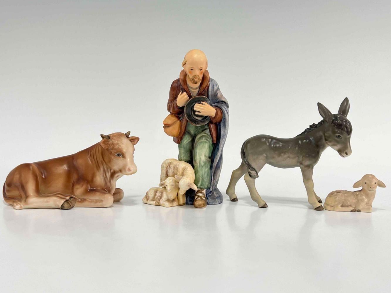 10 Piece Goebel Nativity Scene. Marked M.I. Hummel, W. Goebel W. Germany 214/A 1951. Largest Piece Approximately 7.0H x 3.5W x 3.375D in. Smallest Approximately 2.375L x 1.75H x 1.25D in.