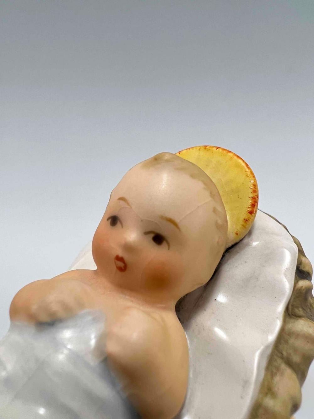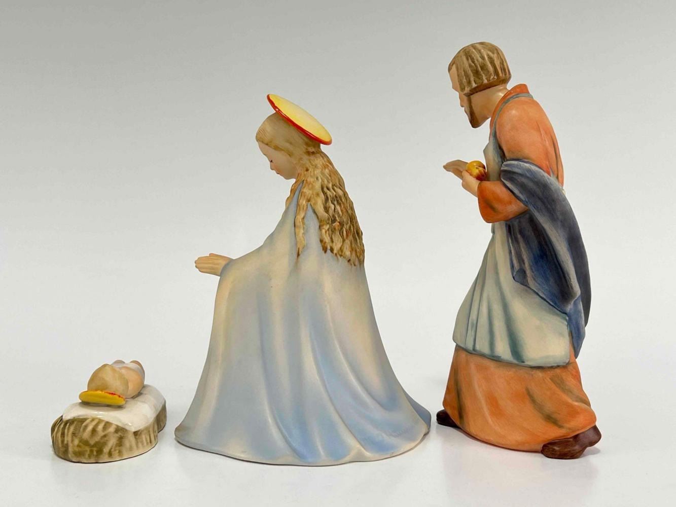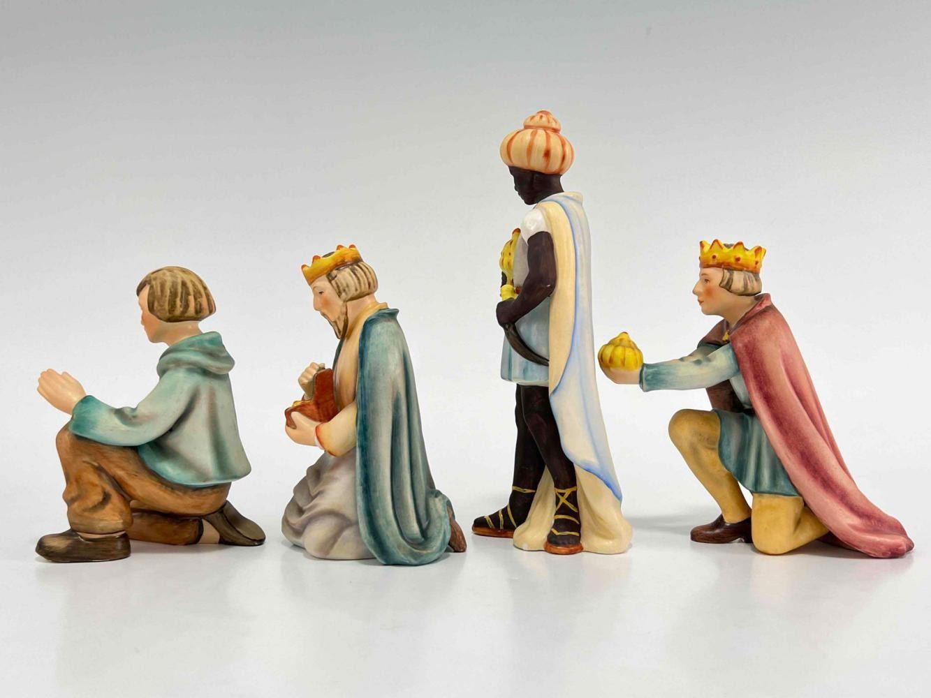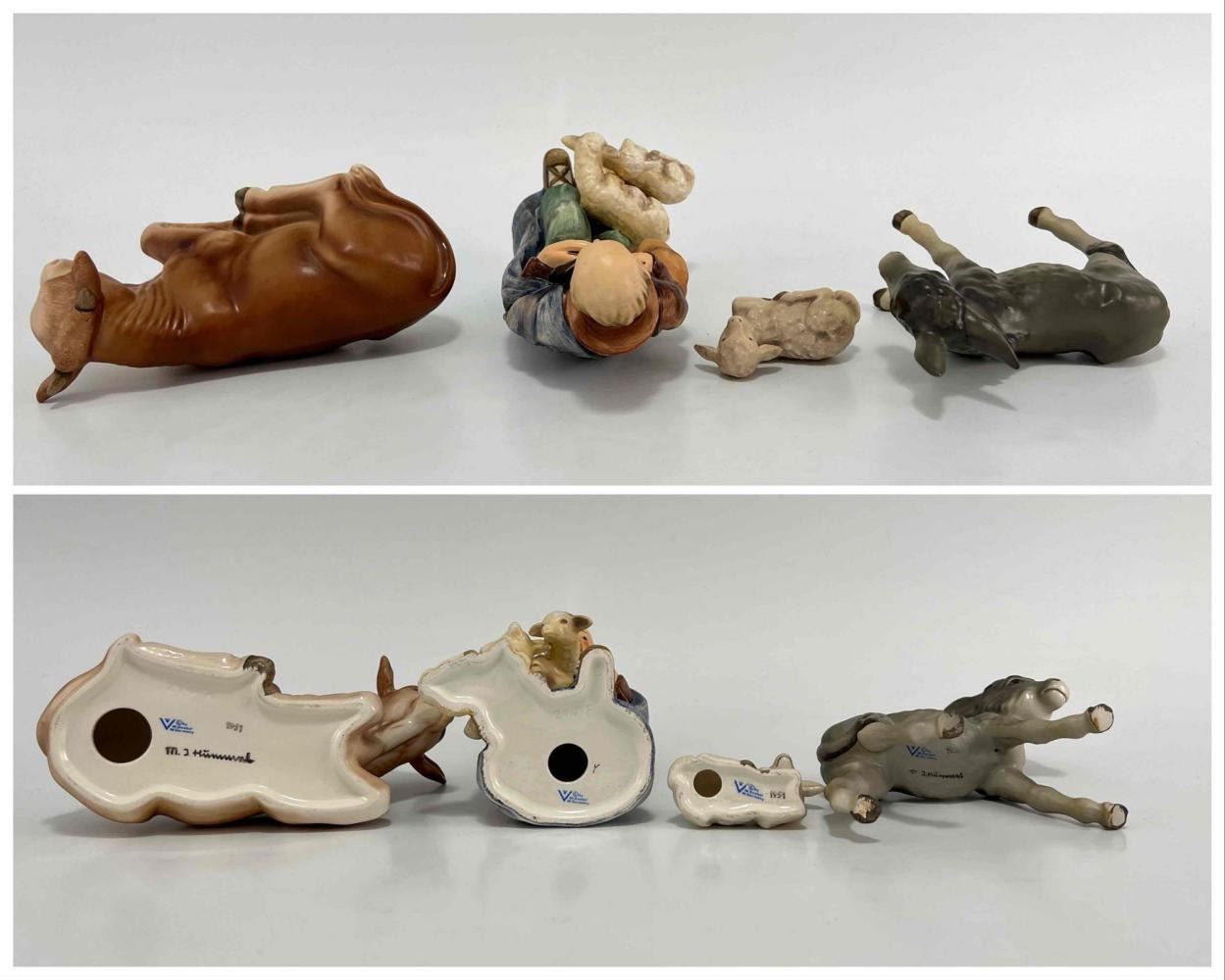 10 Piece Goebel Nativity Scene. Marked M.I. Hummel, W. Goebel W. Germany 214/A 1951. Largest Piece Approximately 7.0H x 3.5W x 3.375D in. Smallest Approximately 2.375L x 1.75H x 1.25D in.