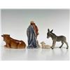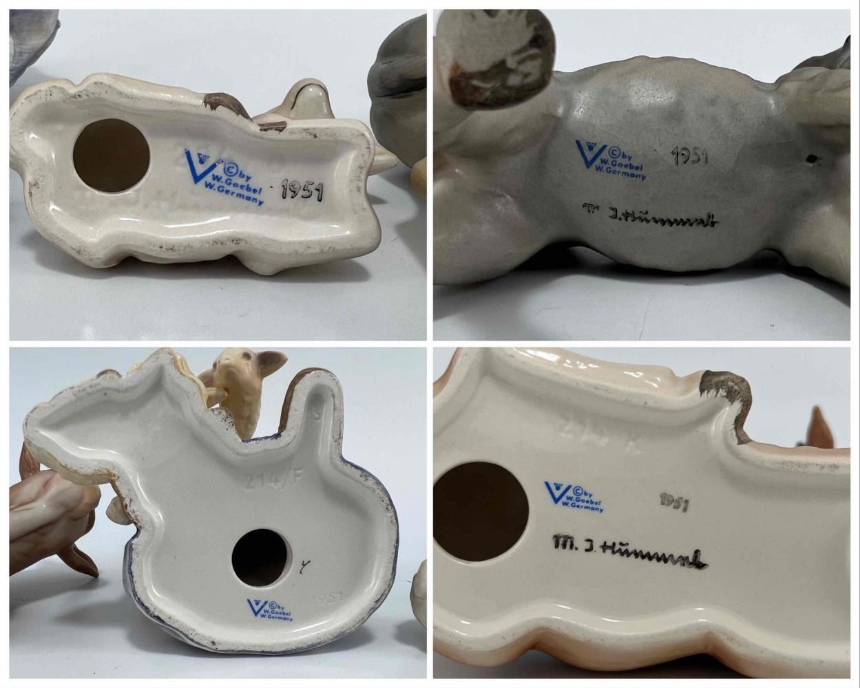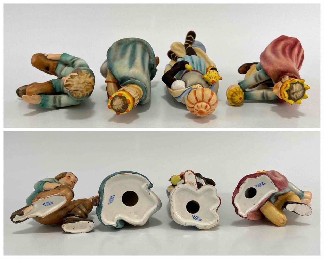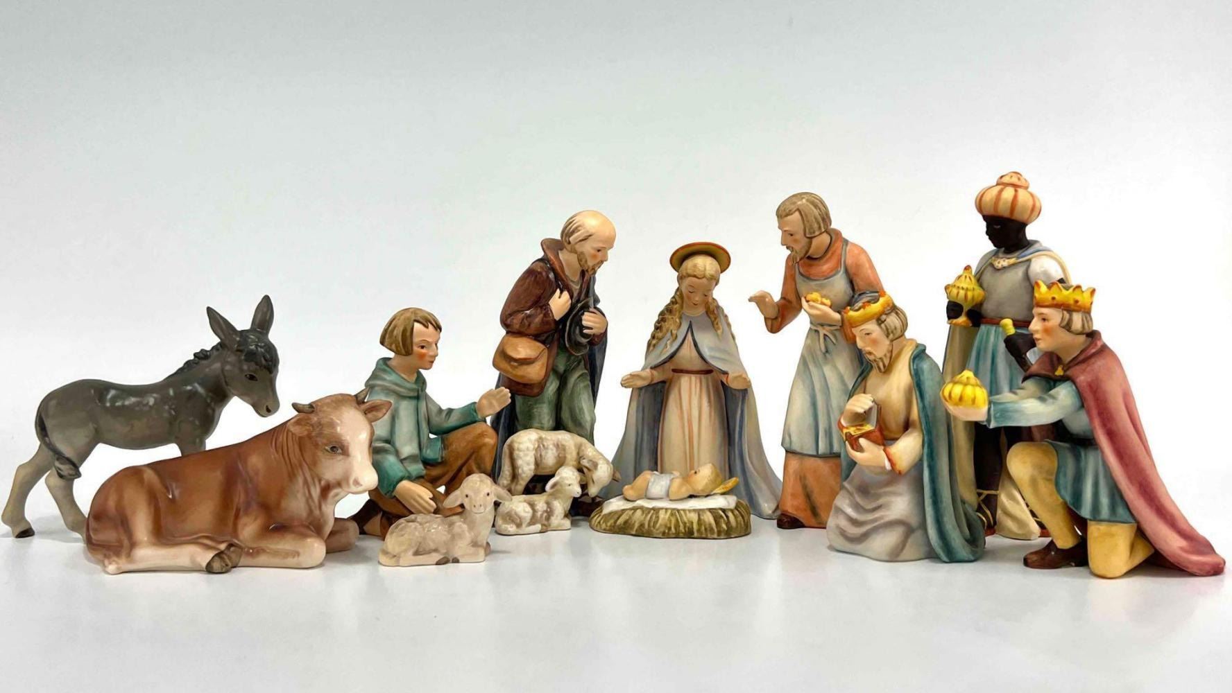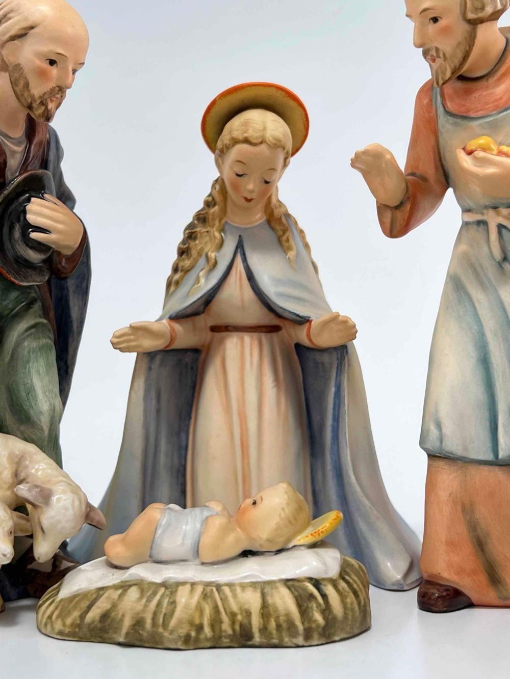 10 Piece Goebel Nativity Scene. Marked M.I. Hummel, W. Goebel W. Germany 214/A 1951. Largest Piece Approximately 7.0H x 3.5W x 3.375D in. Smallest Approximately 2.375L x 1.75H x 1.25D in.