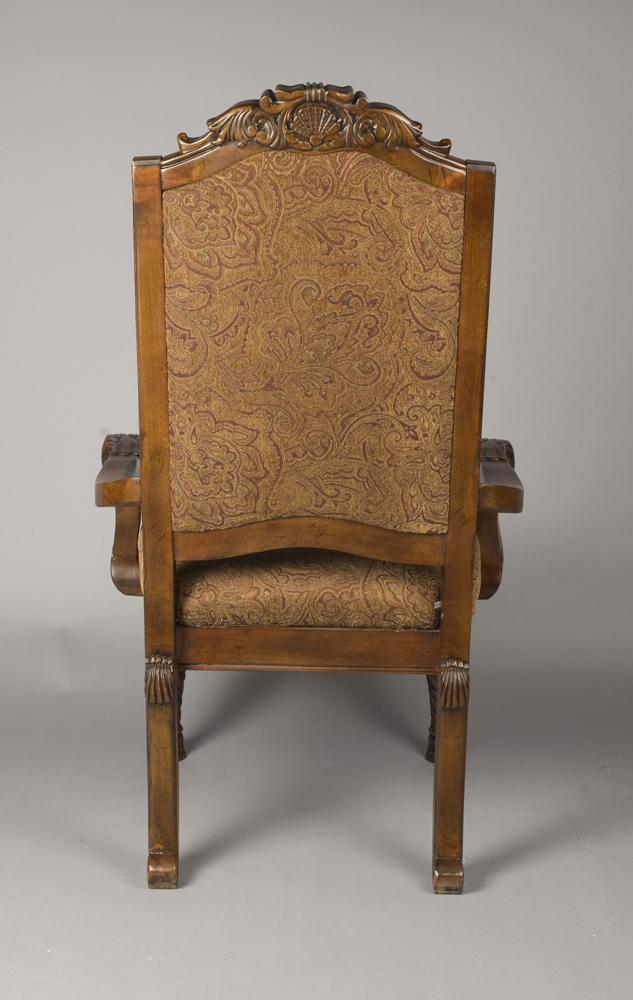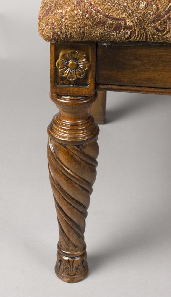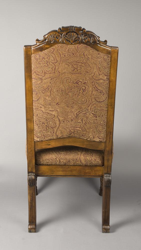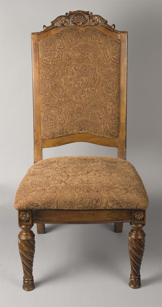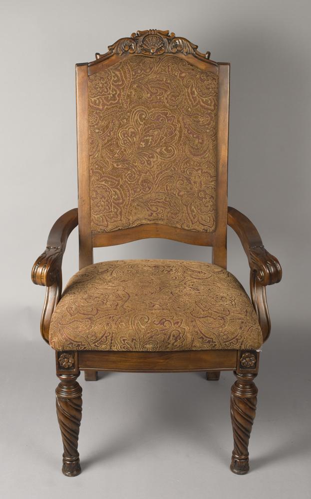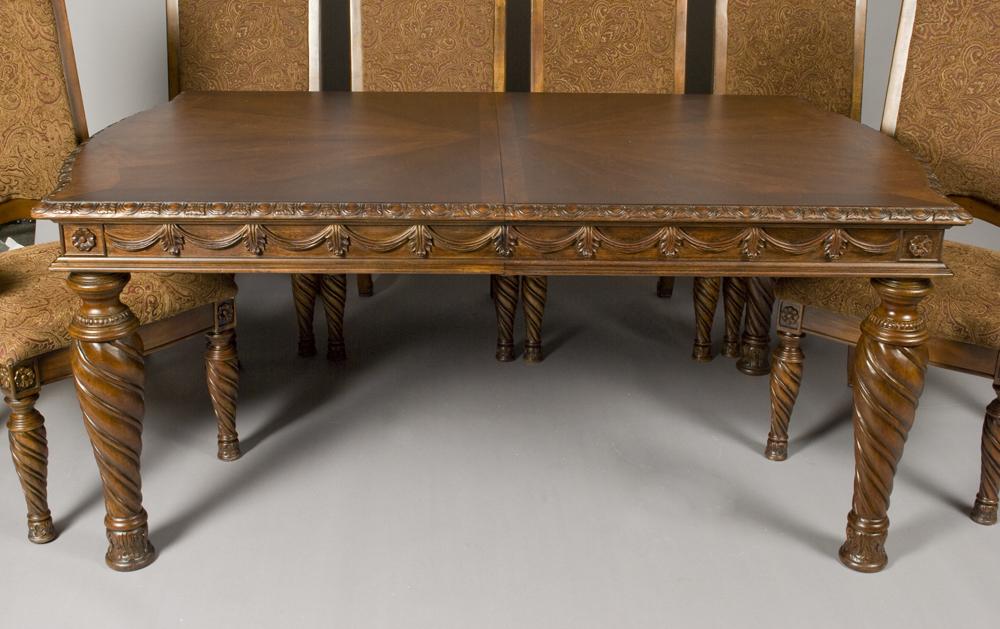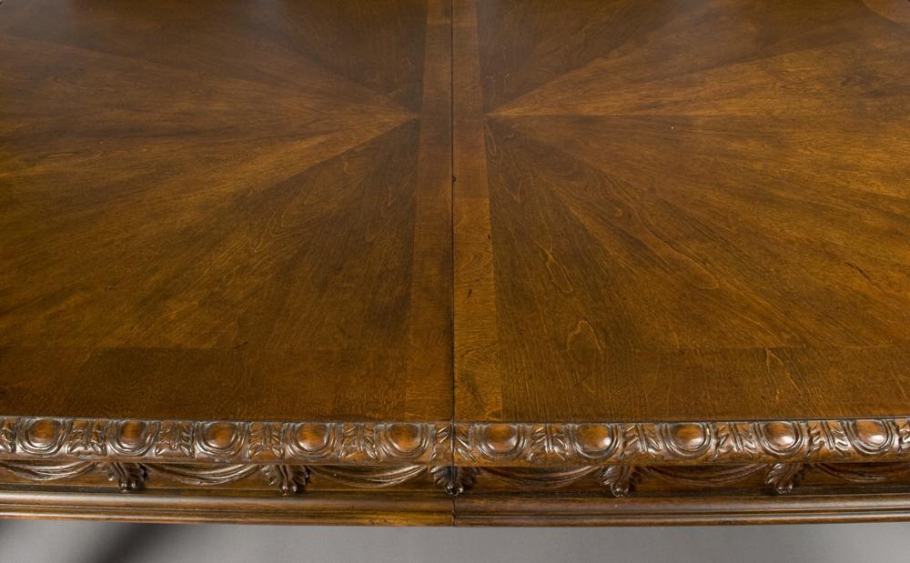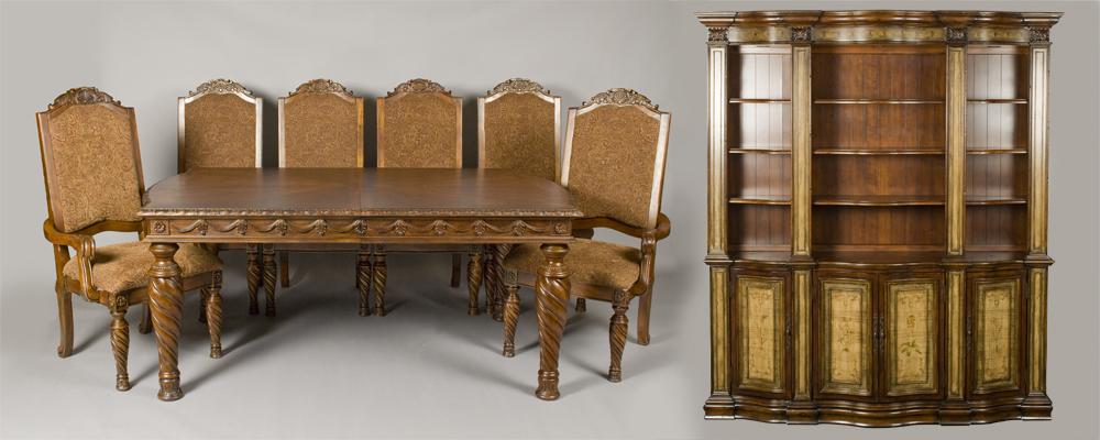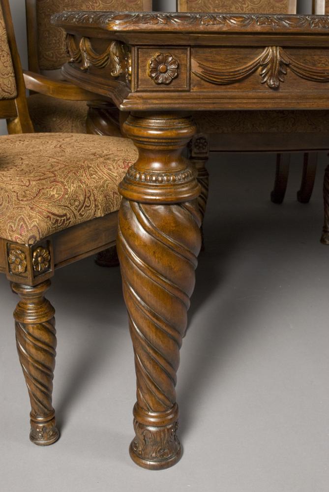 Includes dining table with 2 extensions, with rope twist legs, the frieze with carved draped swags, and carved table edge. 73"L x 44"W x 31"H, each leaf 18"W. 6 chairs, one an arm chair with rope twist front legs and carved crest. 47"H x 22"W x 22"D. And a side board and hutch combo, with painted and carved highlights, 77"W x 113"H x 16"D. All in excellent condition. Provenance: Just removed from a 16,000 square foot mansion in Oxford, Michigan.