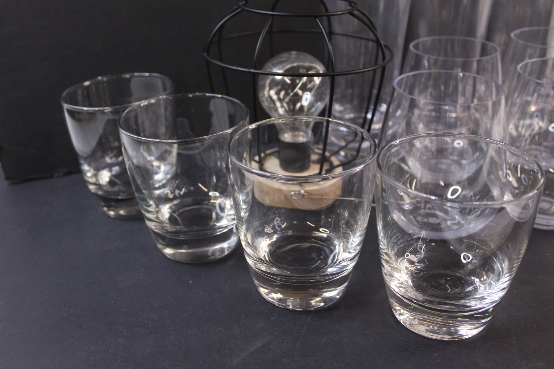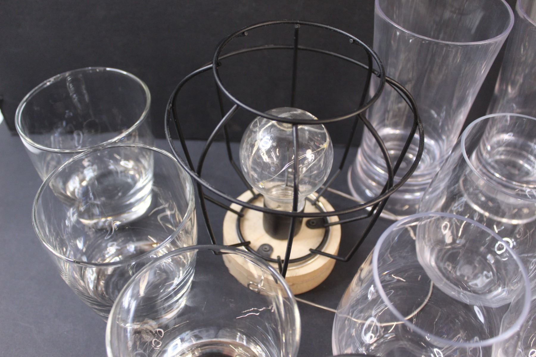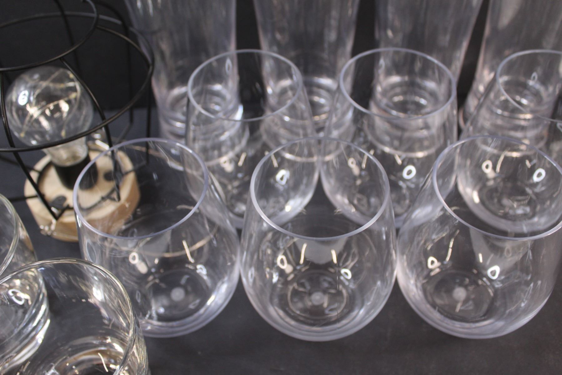 (10) Plastic Glasses, (4) Glass Glasses, Battery Operated Flickering Light (Works)