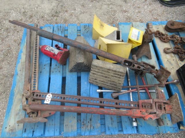 10 Plus Items- 3 Jackalls, 3 Tire Irons, 3 Sets Tire Wedges, Hydraulic Bottle Jacks