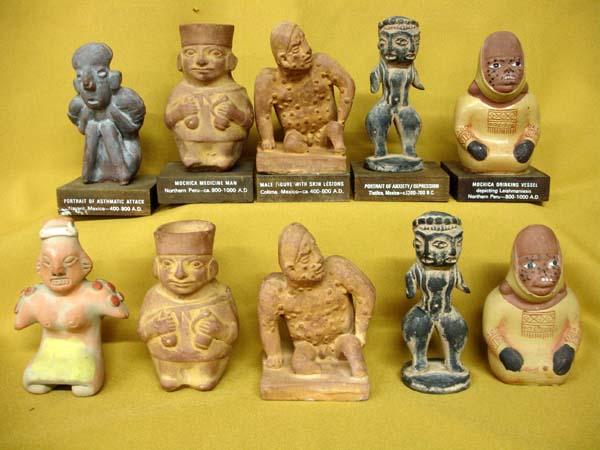 10 Pre-Columbian Replica Clay Figures for Schering Co.'s Advertising. These figures are ''afflicted'' with various conditions. The wood base describes the ailment on the front and also notes the area and time period from which the clay figure comes. On the back of the base is the Schering-made drug that would be used to treat the ailment. There are 6 different figure types, 5 with bases. The tallest figure (double faced standing person) is 4.5''Hx3''W. Buyers Pay Actual Shipping and Handling Charges(see terms and conditions for more information).