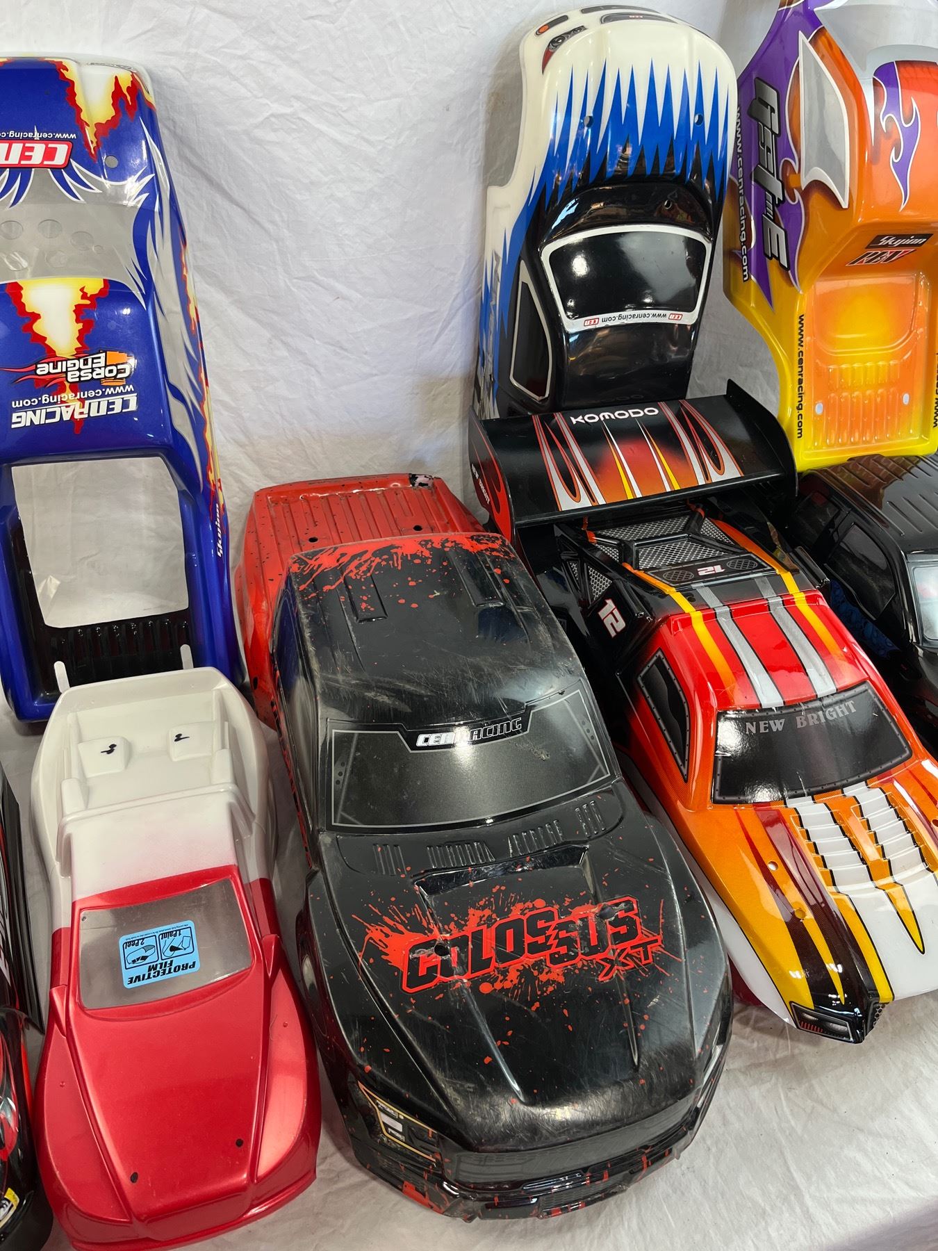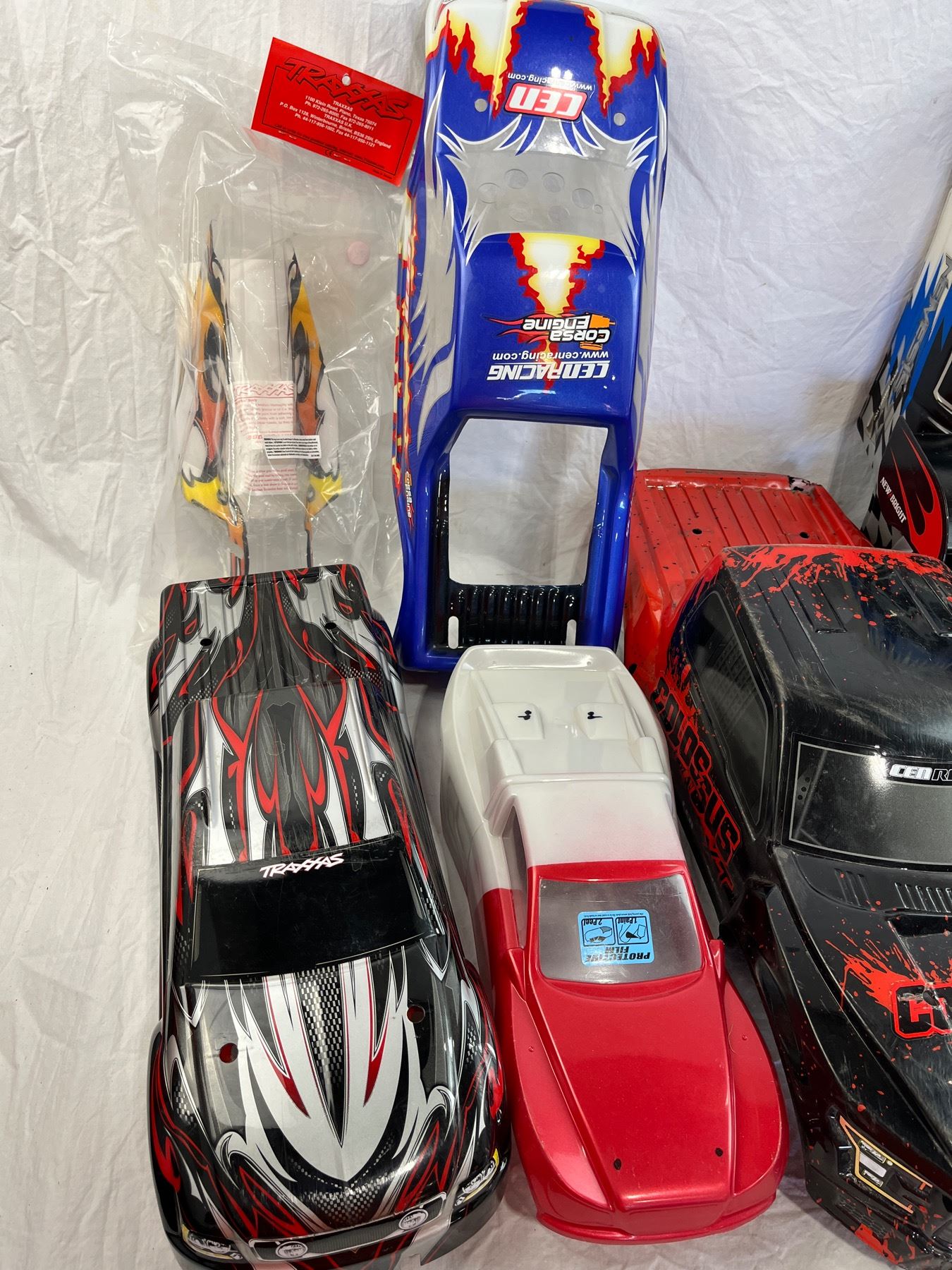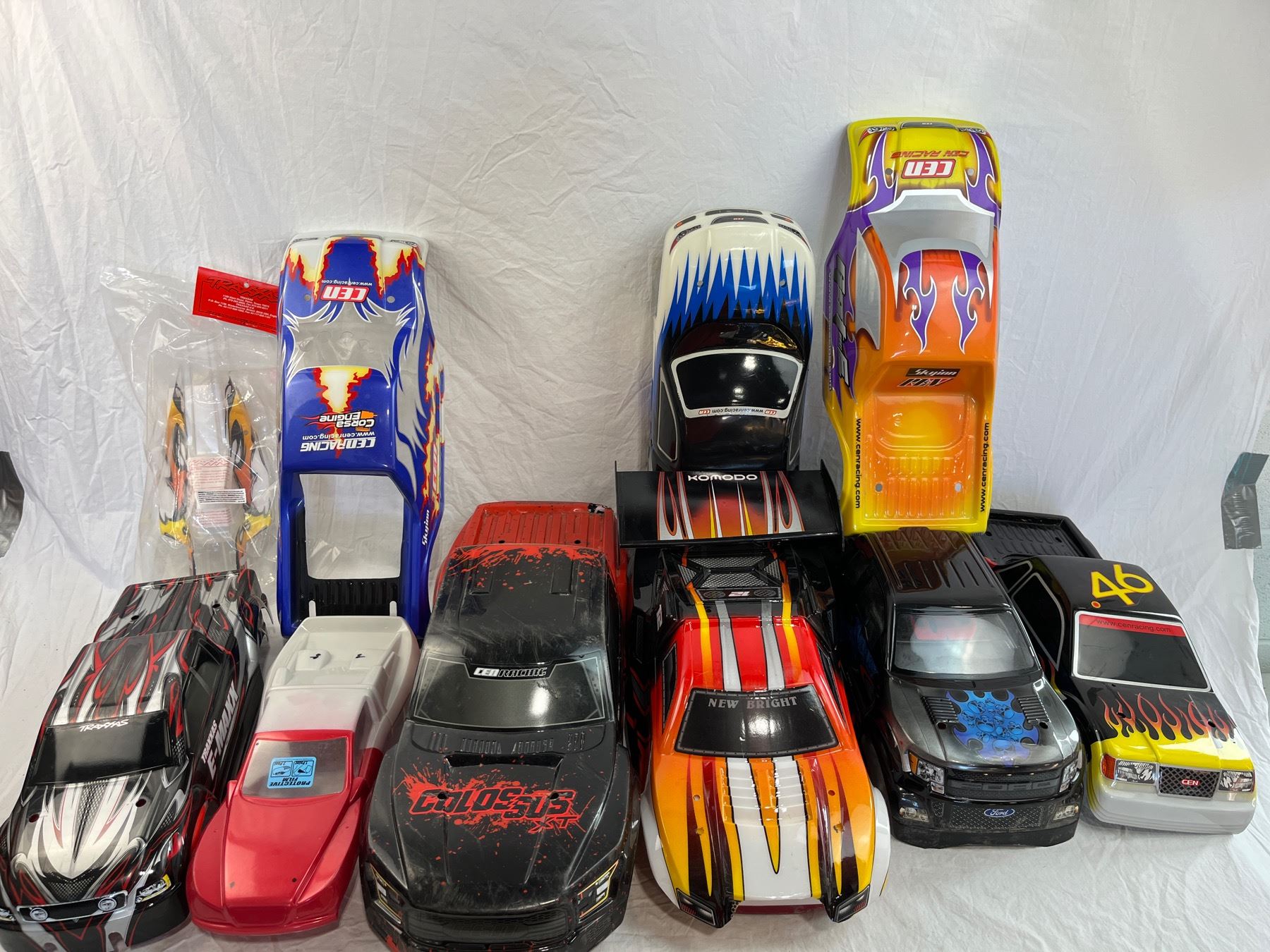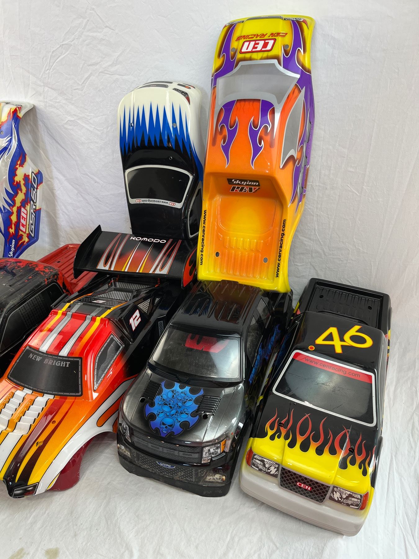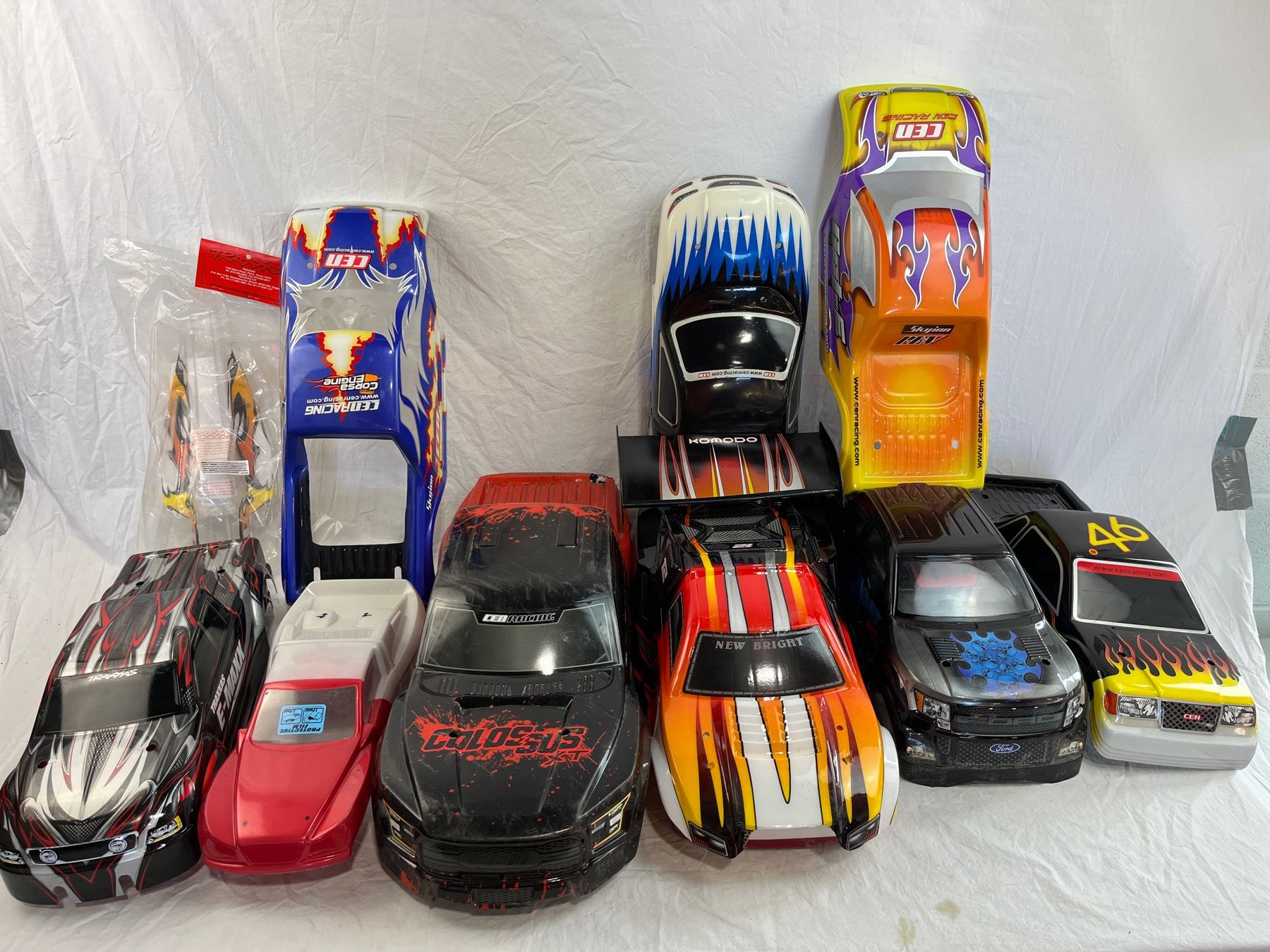 Group lot of mixed RC Car skins including CEN, Genesis Truck Bodies, Traxxas, F150 raptor, Colossus and Nemesis styles.