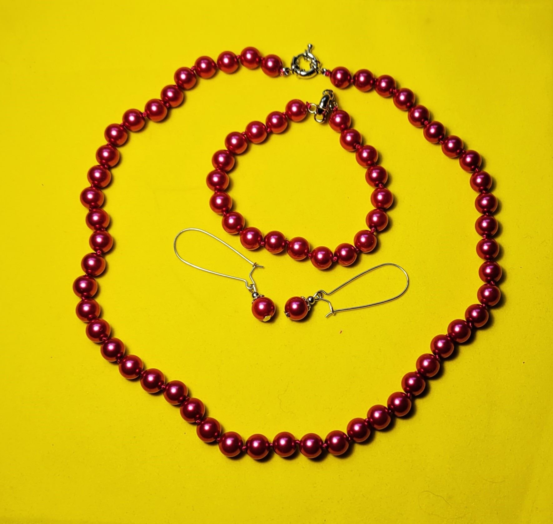 10) RED/PINK SHELL PEARL 8" BRACELET, DROP EARRIN