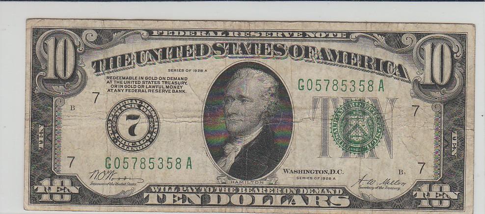 $10 REDEEMABLE IN GOLD NOTE NUMERICAL 7 1928