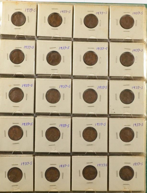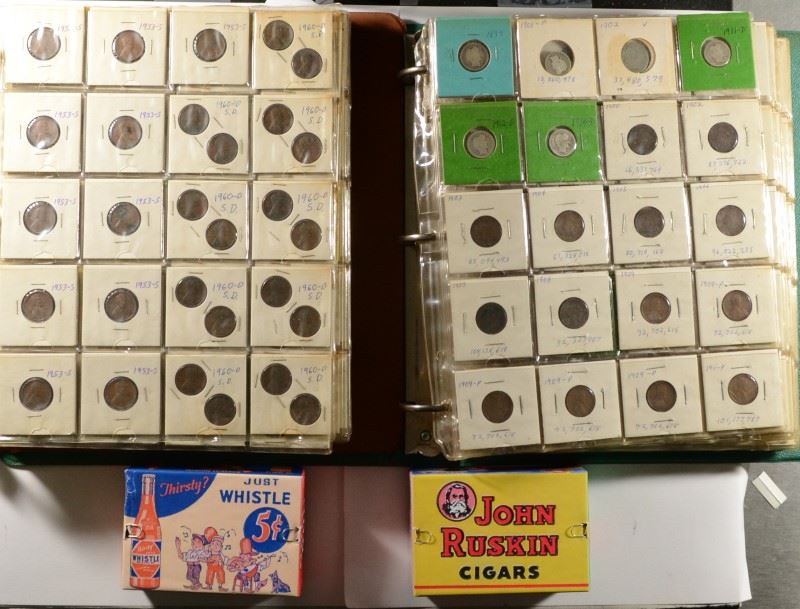 STOCK BOOK WITH OVER 240 COINS--WITH SILVER DIMES, INDIAN CENTS, LINCOLNS & STOCK BOOK WITH OVER 275 COINS--LINCOLN CENTS, NICKELS, BUFFALO NICKELS, ETC.; 10 ROLLS LINCOLN WHEAT CENTS IN JOHN RUSKIN CIGAR STYLE BOX & THIRSTY? JUST WHISTLE BOX (BOTH APPROX 4 1/2" x 3" x 1 1/2") EST 1000.00-1100.00