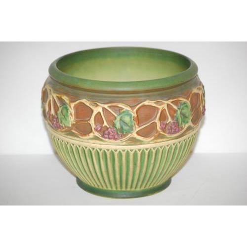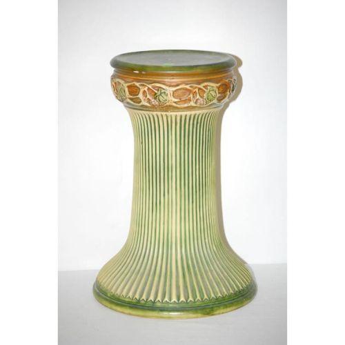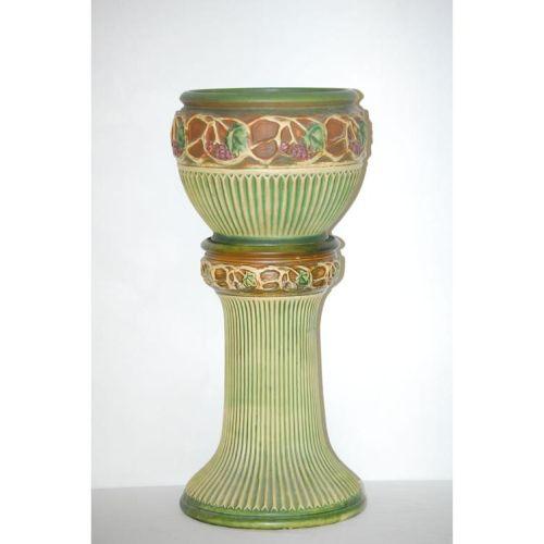 10" ROSEVILLE GREEN NORMANDY JARDINERE & PEDESTAL- UNMARKED JARDINERE (10" T X 12" DIA.; PEDESTAL-18" T)- MINOR CRAZING & WEAR, FLAT BASE RIM CHIP TO JARDINERE