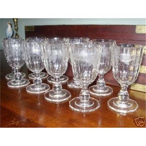 Up for sale from a Baltimore Maryland estate is a very rare set of 10 early Boston and Sandwich flint glass Grape on vine engraved red wine glasses. They date from the Lacy period circa 1830-1850. This pattern was made for president Andrew Jackson in the 1830's and used by him in the White house with American made white & gold porcelain from the Tucker factory. The flint glasses are wheel engraved with grapes & grape leaves around a panel cut cup on a balustrade stem. Each has a polished pontil mark on the bottom. It is very rare to find a matched set of six or eight of these glasses but 10 is very rare. They have a value of $75. to $100. each. Condition: 3 glasses have a small flake on the rim. 4 glasses are in good condition the others have small base flakes. They measure 5" 1/4. Please ask all questions before you bid. Sold as is no returns. I'm happy to send more photo's.