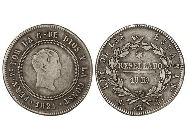 10 Reales. 1821. MADRID. S.R. Módulo 4 Reales. Resellado. (Acuñación floja, normal en esta pieza). Cal-762. MBC-.