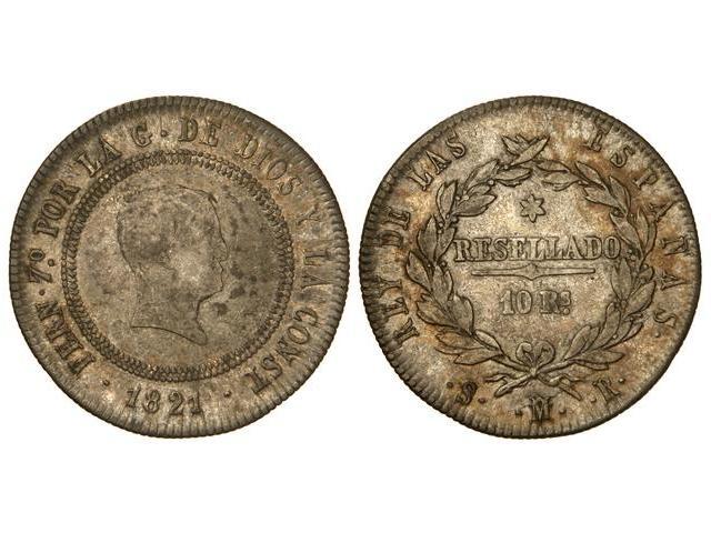 10 Reales. 1821. MADRID. S.R. Resellado. Módulo 4 Reales. Acuñación floja, normal en ésta pieza. Pátina. Cal-762. MBC.