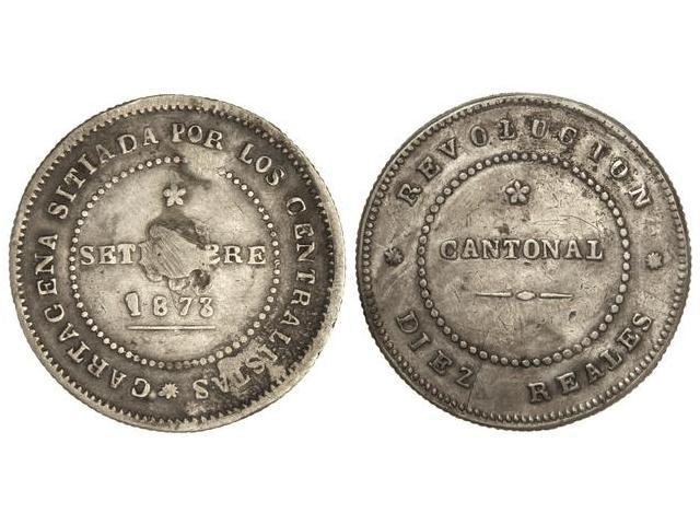 10 Reales. 1873. CARTAGENA. 13,99 grs. Restos de soldadura en anverso. BC+/MBC.