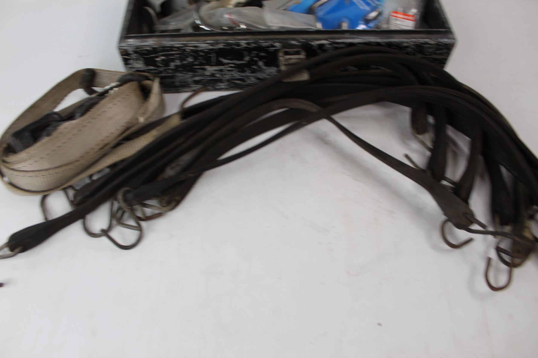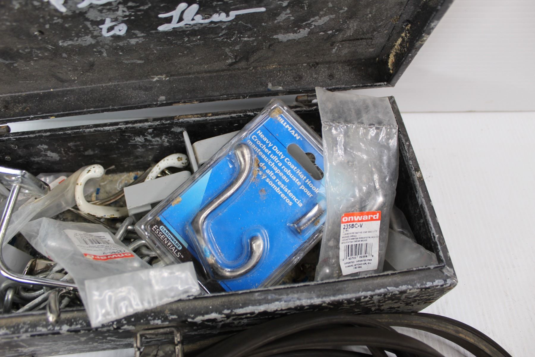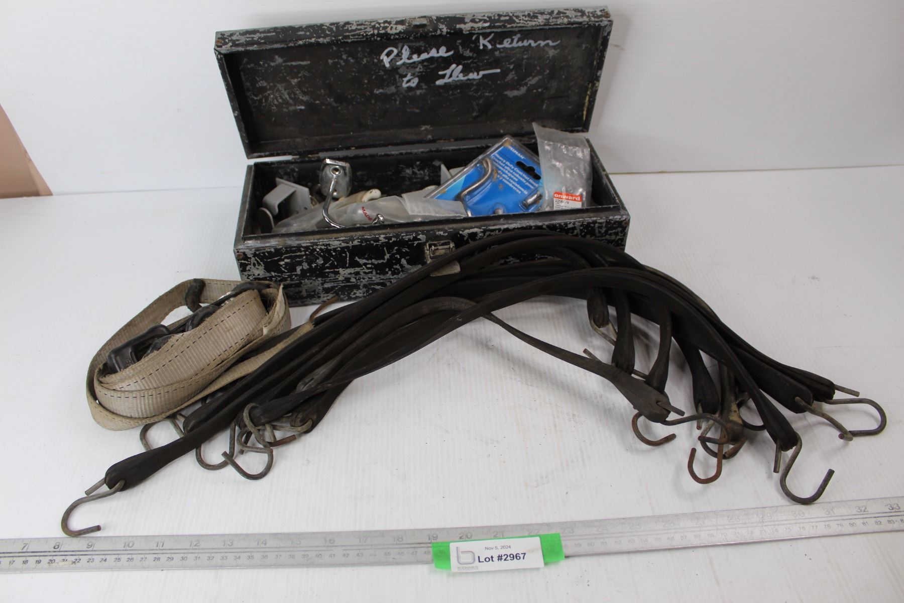 (10) Rubber Bungee Straps, Rachet Strap, Metal tool Bow w/ Chains, Coat Hooks, Misc.