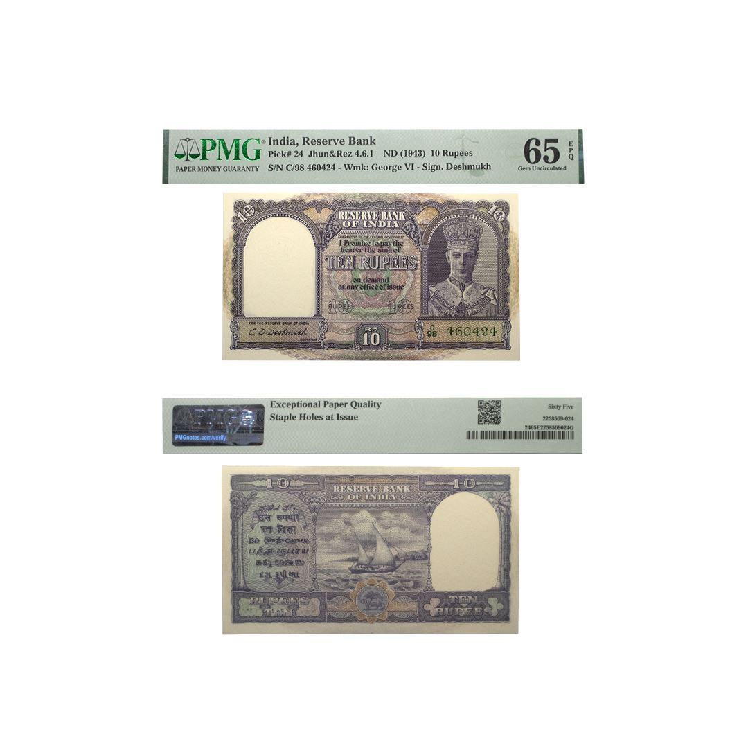 10 Rupee, British India, George VI, ND (1944), signed by C.D. Deshmukh, serial number: C98 460424, in green, J&R 4.6.1. Graded as Gem Uncirculated 65 by PMG, Rare.