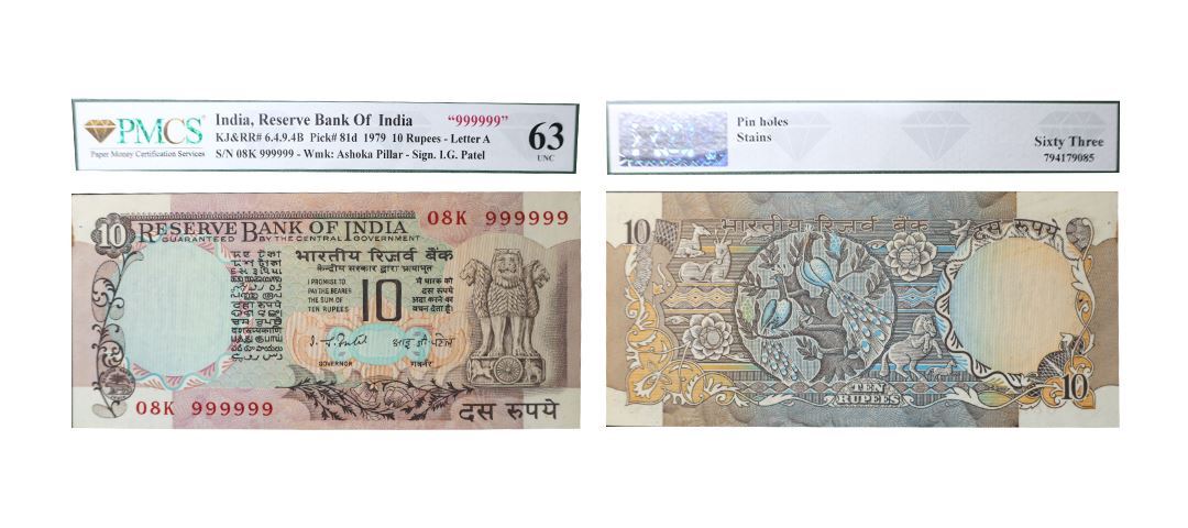 10 Rupees, Peacock Series, Fancy Number, Signed by I.G. Patel, Inset B, Serial No. 08K 999999, PMCS Graded Uncirculated 63, Stains Very Rare.
