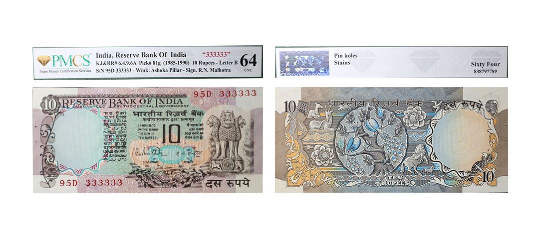 10 Rupees, Peacock Series, Fancy Number, Signed by R.N. Malhotra, Inset B, Serial No. 95D 333333, PMCS Graded Uncirculated 64, Stains Very Rare.