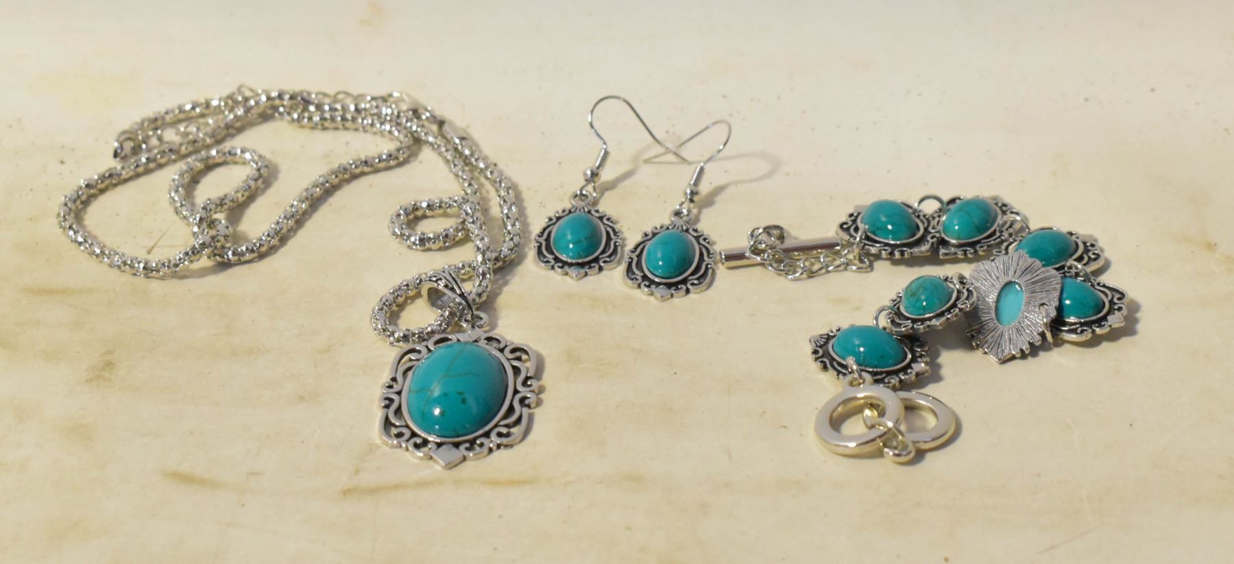 JEWELERY NINCLUDING: DROP EARRINGS, BRACELET WITH TOGGLE CLOSURE, AND OVAL PENDANT ON 22" CHAIN WITH 2" EXTENDER. JEWELERY