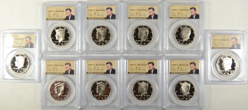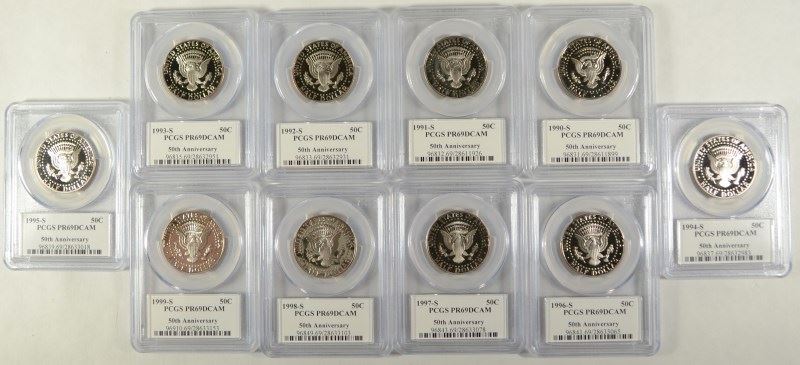(10) SLABBED PROOF KENNEDY HALF DOLLARS PCGS PR-69 DCAM (1990, 1991, 1992, 1993,