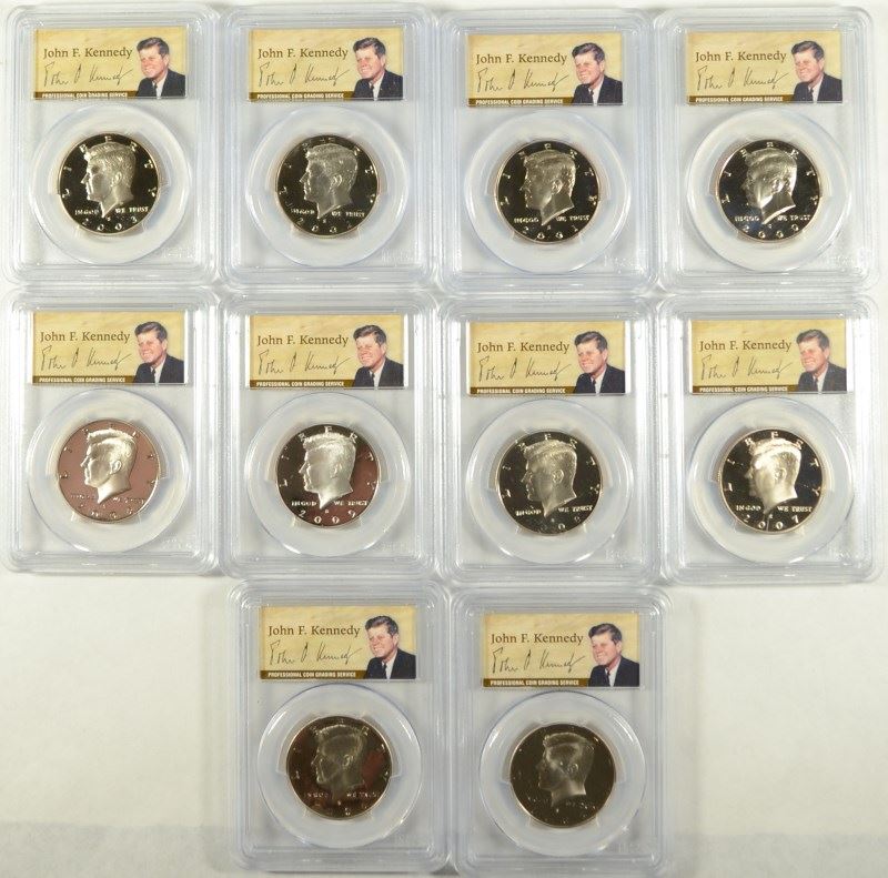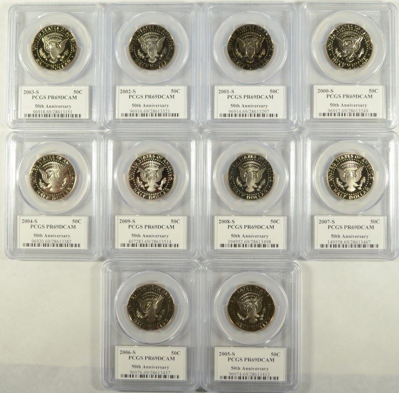 (10) SLABBED PROOF KENNEDY HALF DOLLARS PCGS PR-69 DCAM (2000, 2001, 2002, 2003,