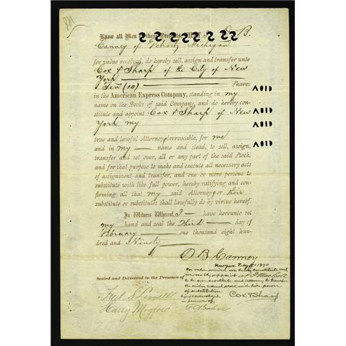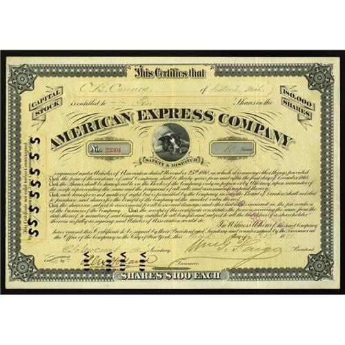 <B>American Express. 10 Shares</B></I><BR>Stock signed by William G. Fargo of Wells-Fargo fame, dated 1881 with the "Safety & Dispatch" vignette of the dog (mascot of American Express). Engraved by American Bank Note. A truly exciting stock to own. A very attractive portrait of Fargo is included. <B>Extremely Fine.</B></I>