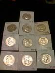 Ten 90% silver half dollars, all bu cor better