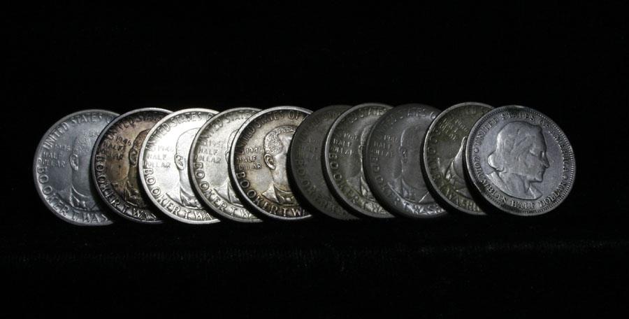 9 Booker T. Washington Halves and 1 Columbian Exposition Halves, 1893 and 1940's. Estimated Value $200