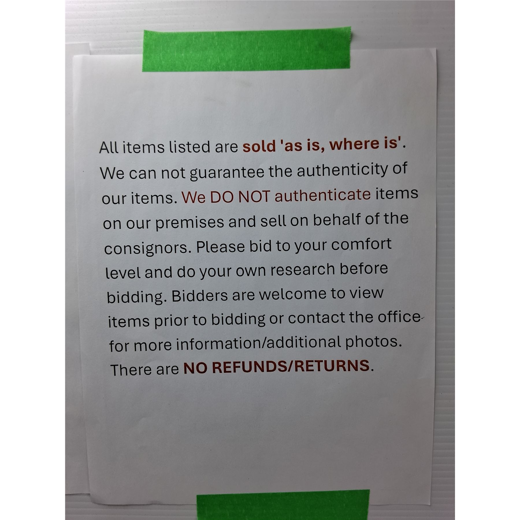 All items listed are sold 'as is, where is'. We cannot guarantee the authenticity of our items. We DO NOT authenticate items on our premises and sell on behalf of the consignors. Please bid to your comfort level and do your own research before bidding. Bidders are welcome to view items prior to bidding or contact the office for more information/additional photos. There are NO REFUNDS/RETURNS.