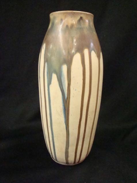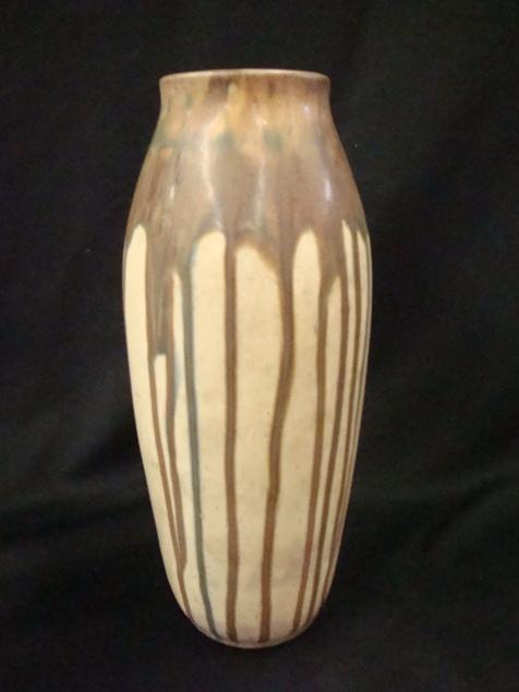 Very interesting ceramic hand thrown vase with overall drip pattern covering a soft glossy finish. Some light overall wear. Nice appearance