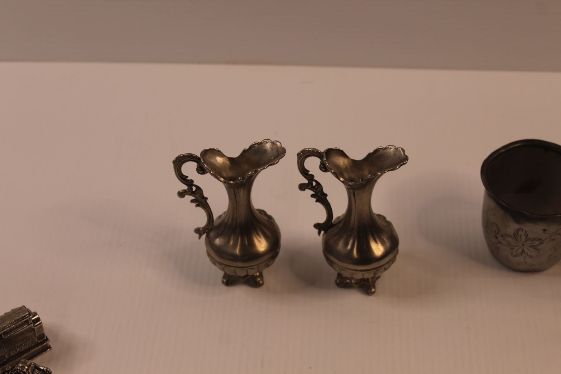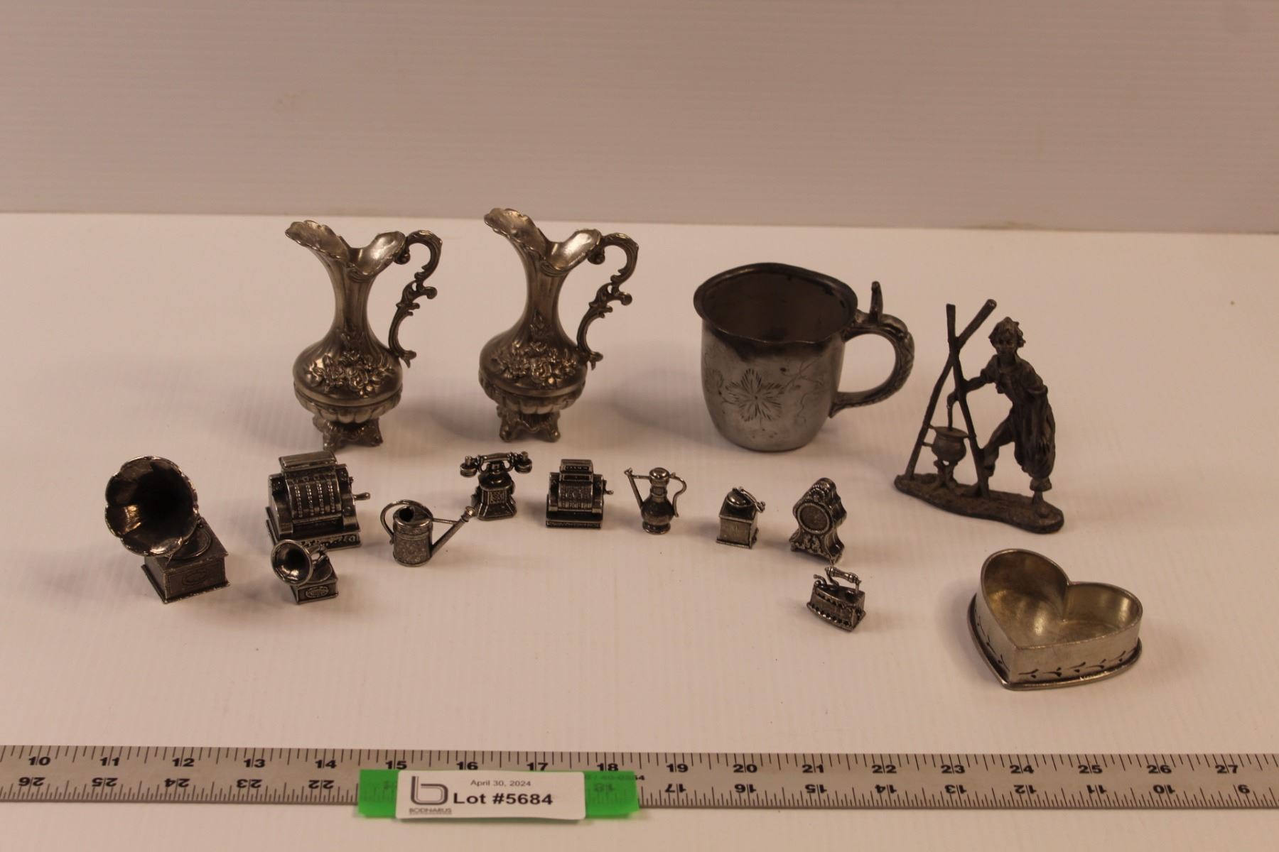 (10) Tin/Pewter Knik-Knacks, Heart Box, Statue, (2) Mini Pitchers & Cup