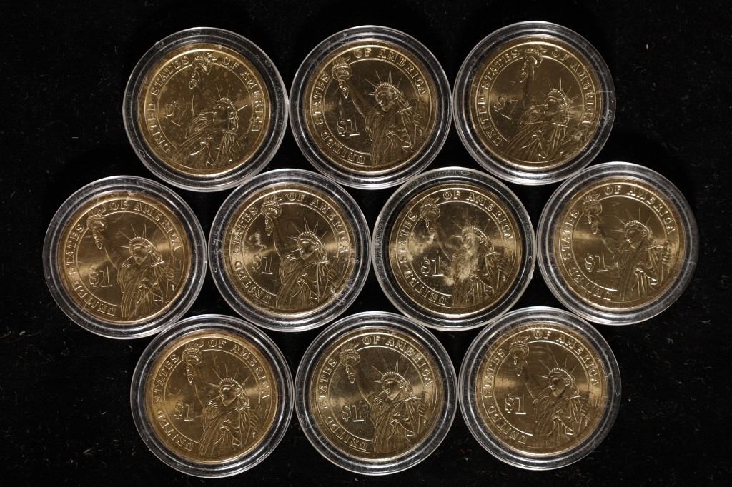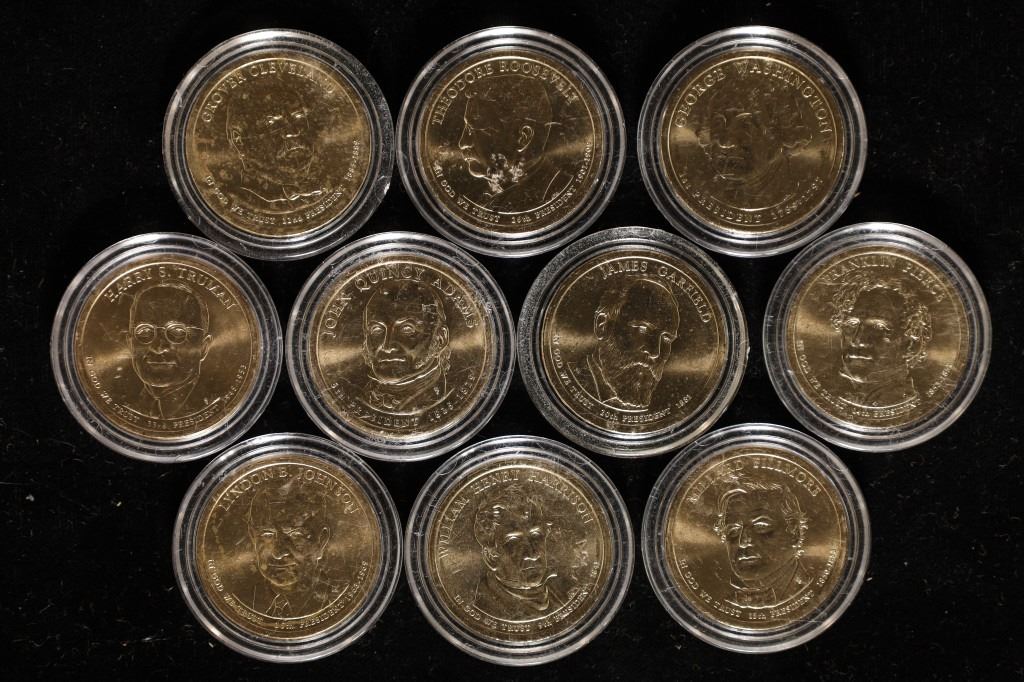 ROOSEVELT, WASHINGTON, TRUMAN, ADAMS, GARFIELD, PIERCE, JOHNSON, HARRISON & FILLMORE. ALL IN HARD PLASTIC CAPSULES AND ALL ARE UNC
