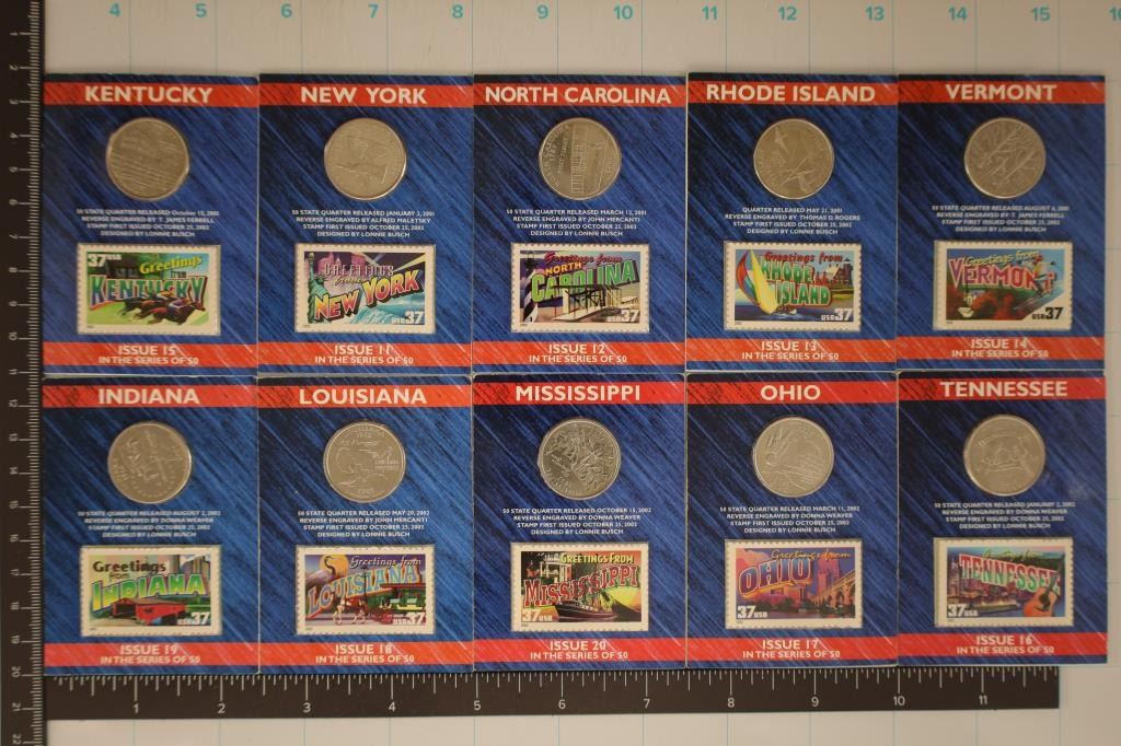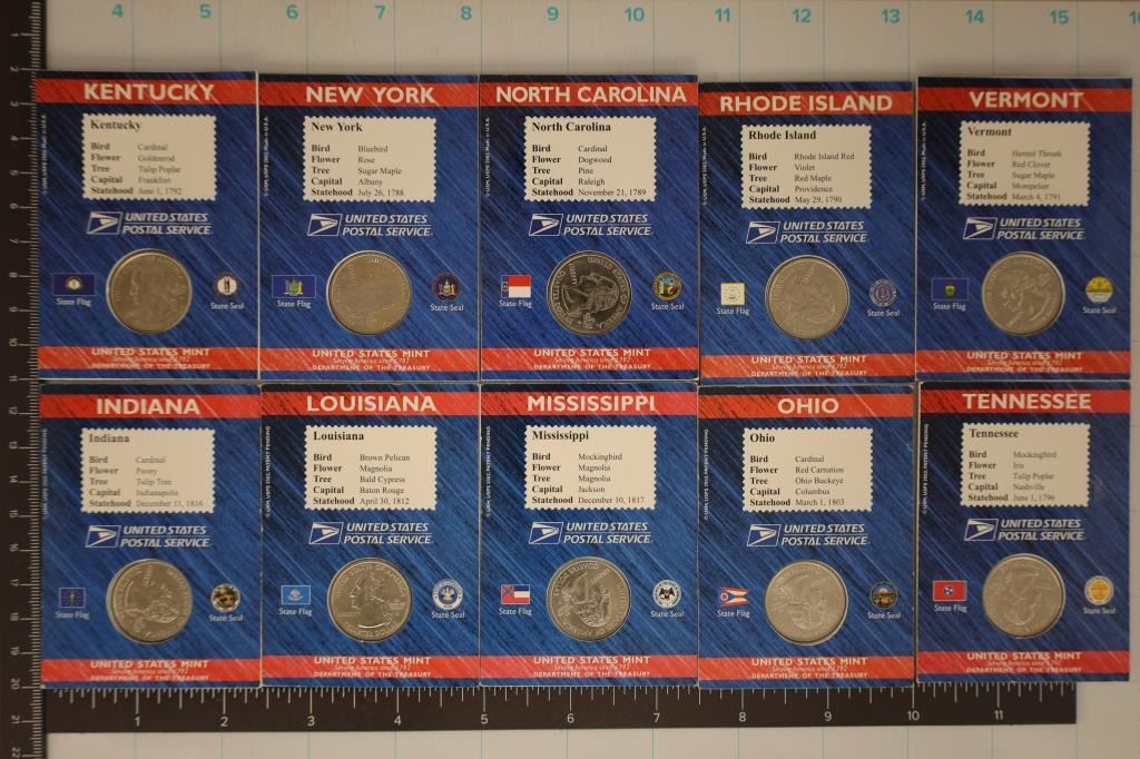SERVICE. EACH IS IN 3 1/2" X 2 1/2" CARD WITH UNCANCELLED 37 CENT STATE STAMP. 2001-D KENTUCKY, NEW YORK, NORTH CAROLINA, RHODE ISLAND AND VERMONT AND 2002-D INDIANA, LOUISIANA, MISSISSIPPI, OHIO AND TENNESSEE.