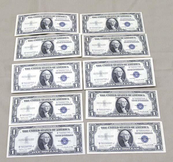 10 Uncirculated 1935 Silver Certificates with consecutive serial numbers. SHI $15.