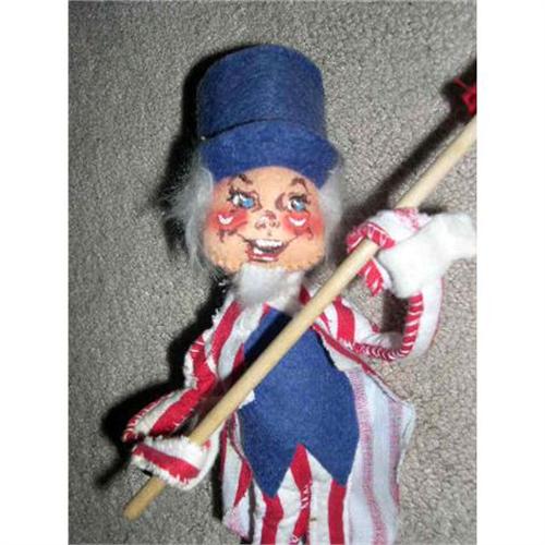 10" Uncle Sam Annalee. What a great piece! There is no tag but you know it's a Annalee. There is some fading to the blue hat and there is a little soil to the outfit. Doll comes from a smoke free environment. Buyer to pay $10 for shipping, handling, and insurance. Thanks for viewing.