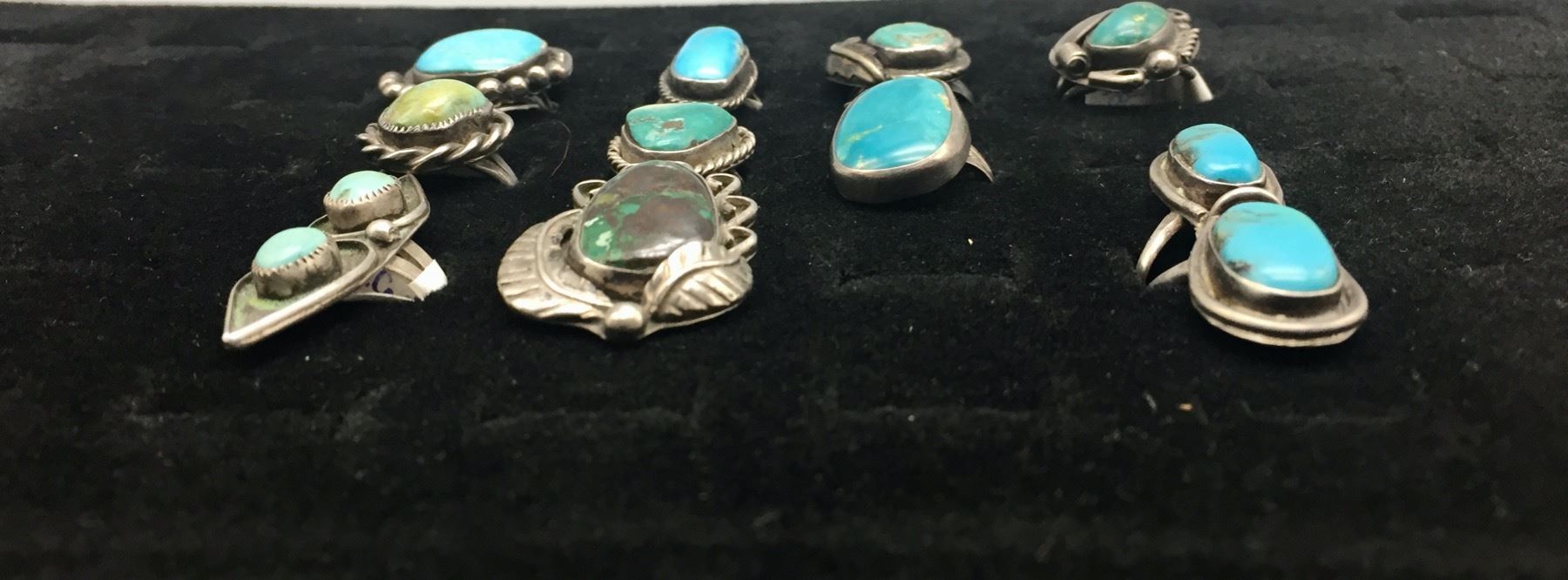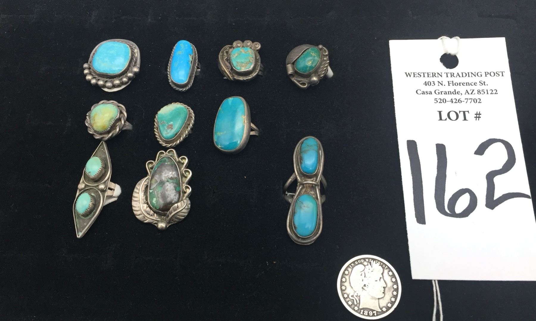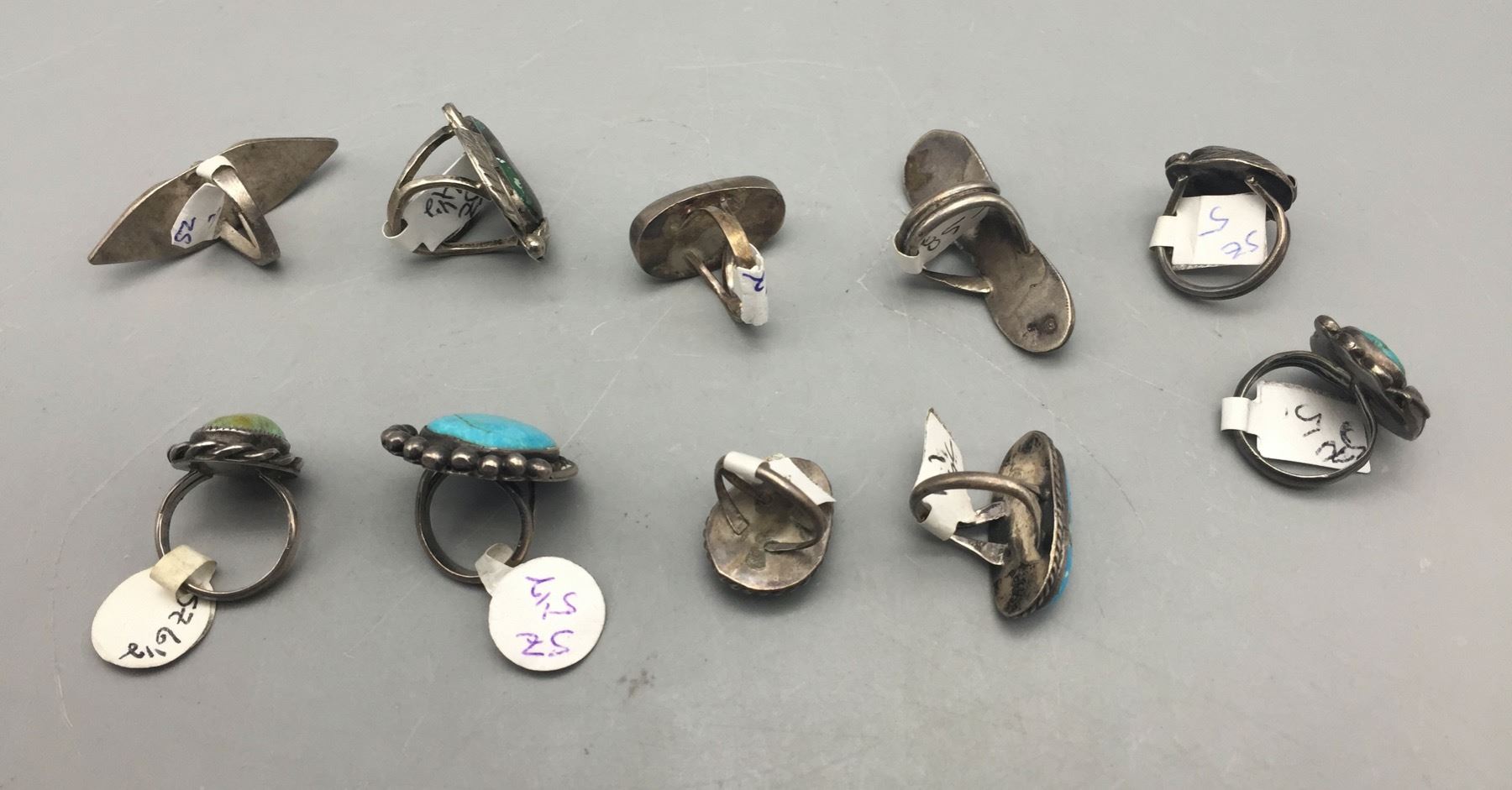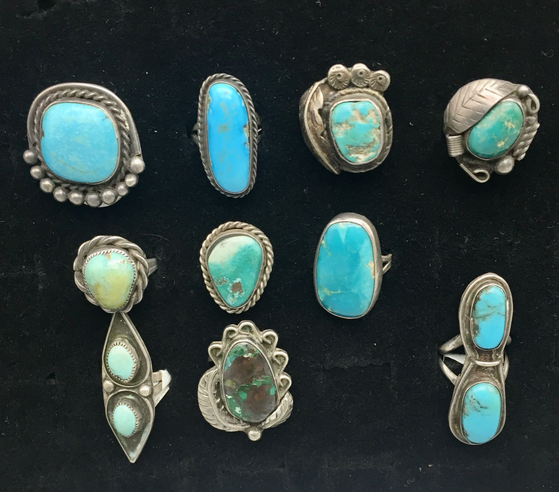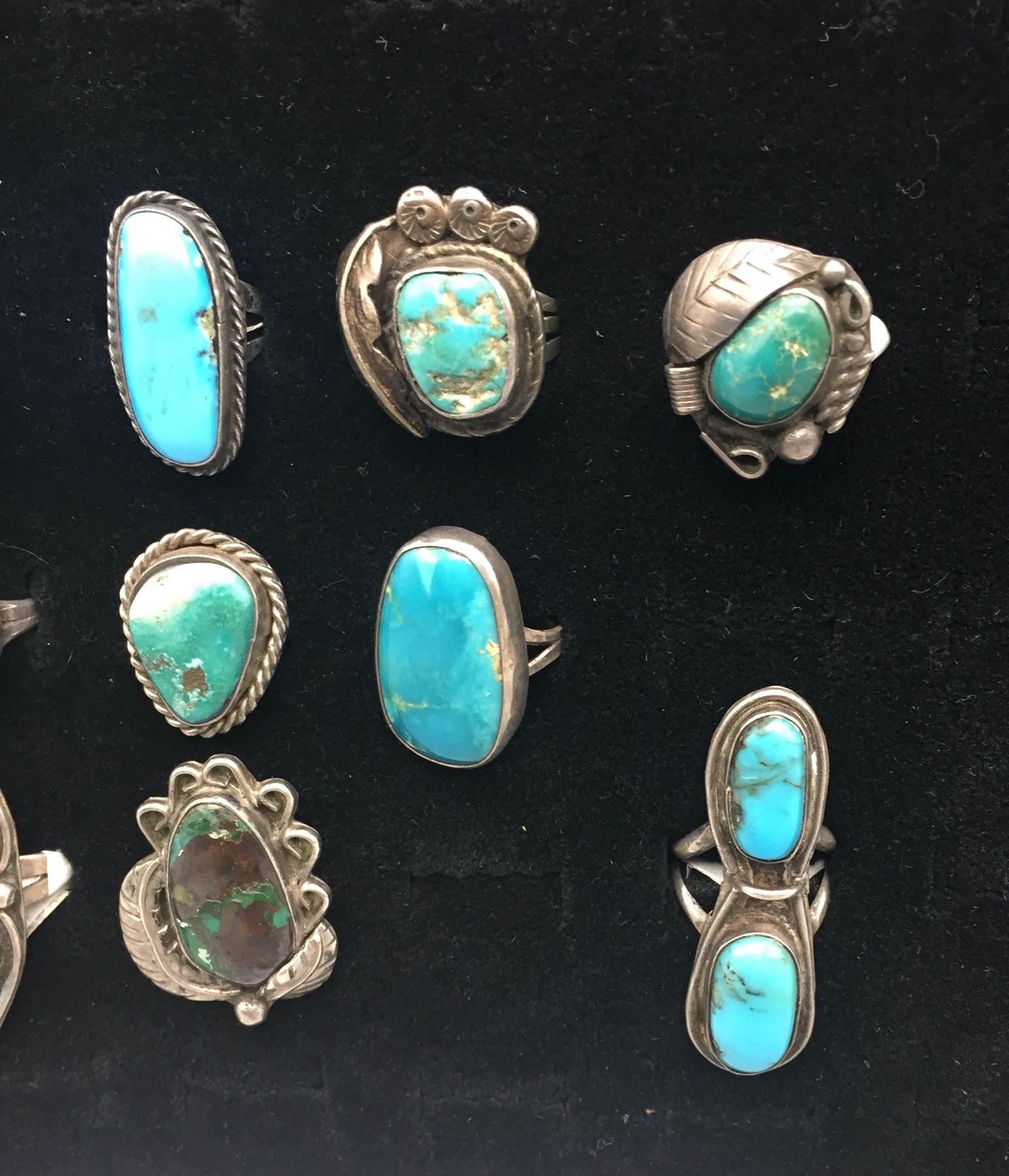 Description: For sale in this lot are 10 lovely turquoise rings in various styles and sizes. All are set with turquoise stones and are sterling silver. Maker: Various. Approx. Age: Vintage. Size: Various. Combined weight is 71.3 grams. Condition: Good for their ages, normal wear expected. Please look closely at the pictures - they are an important part of our description. Shipping: There will be a $5 handling / packaging fee for shipping this lot. The actual cost of postage will be added on top of that.