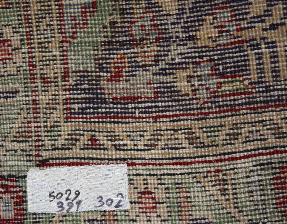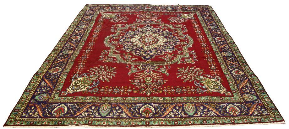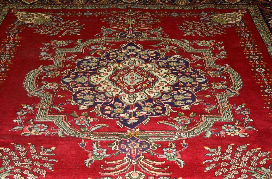 Red field with blue and greens in geometric and floral designs. 9.11 by 13.1 feet. MSRP US$ 3600.00. Very good condition with little to no wear.