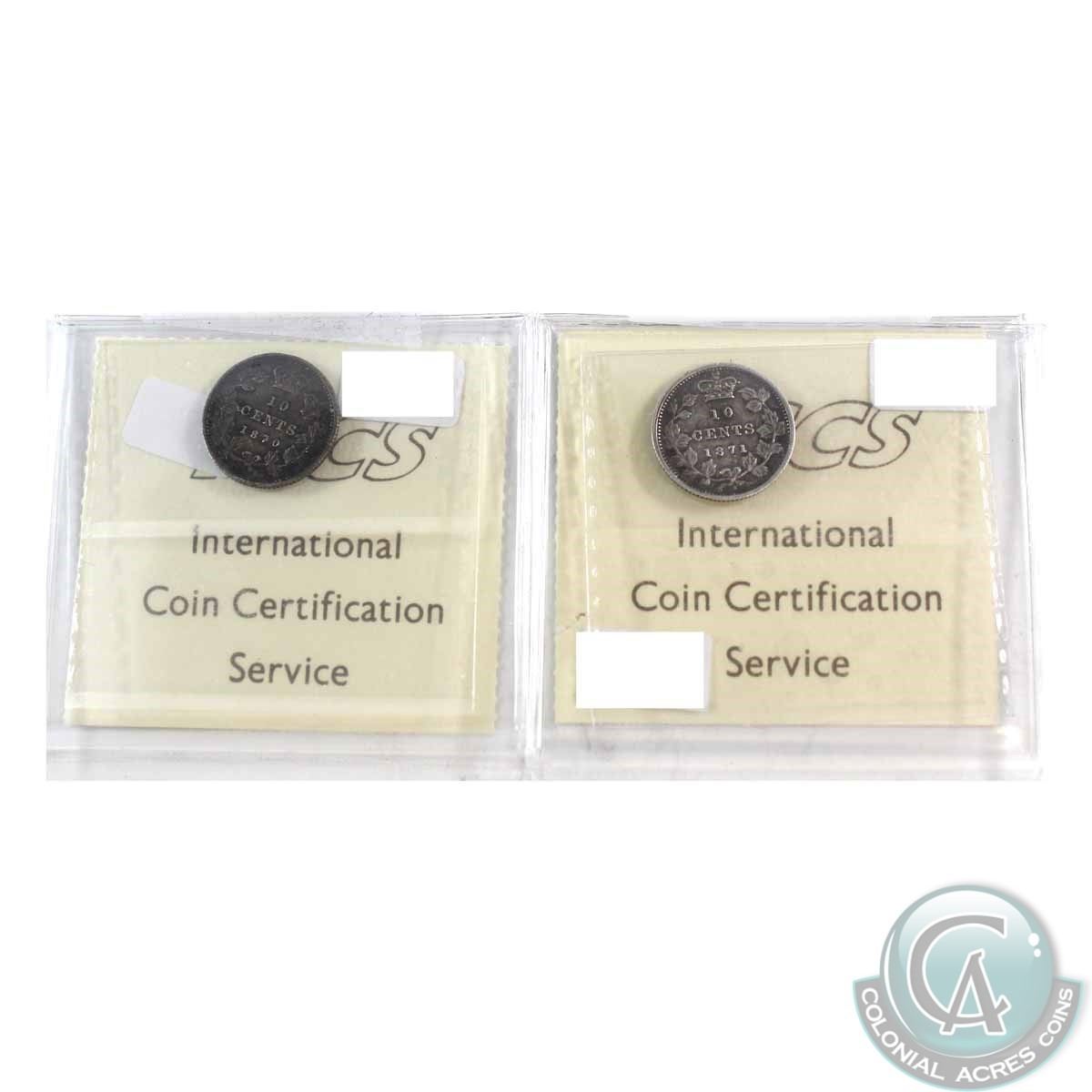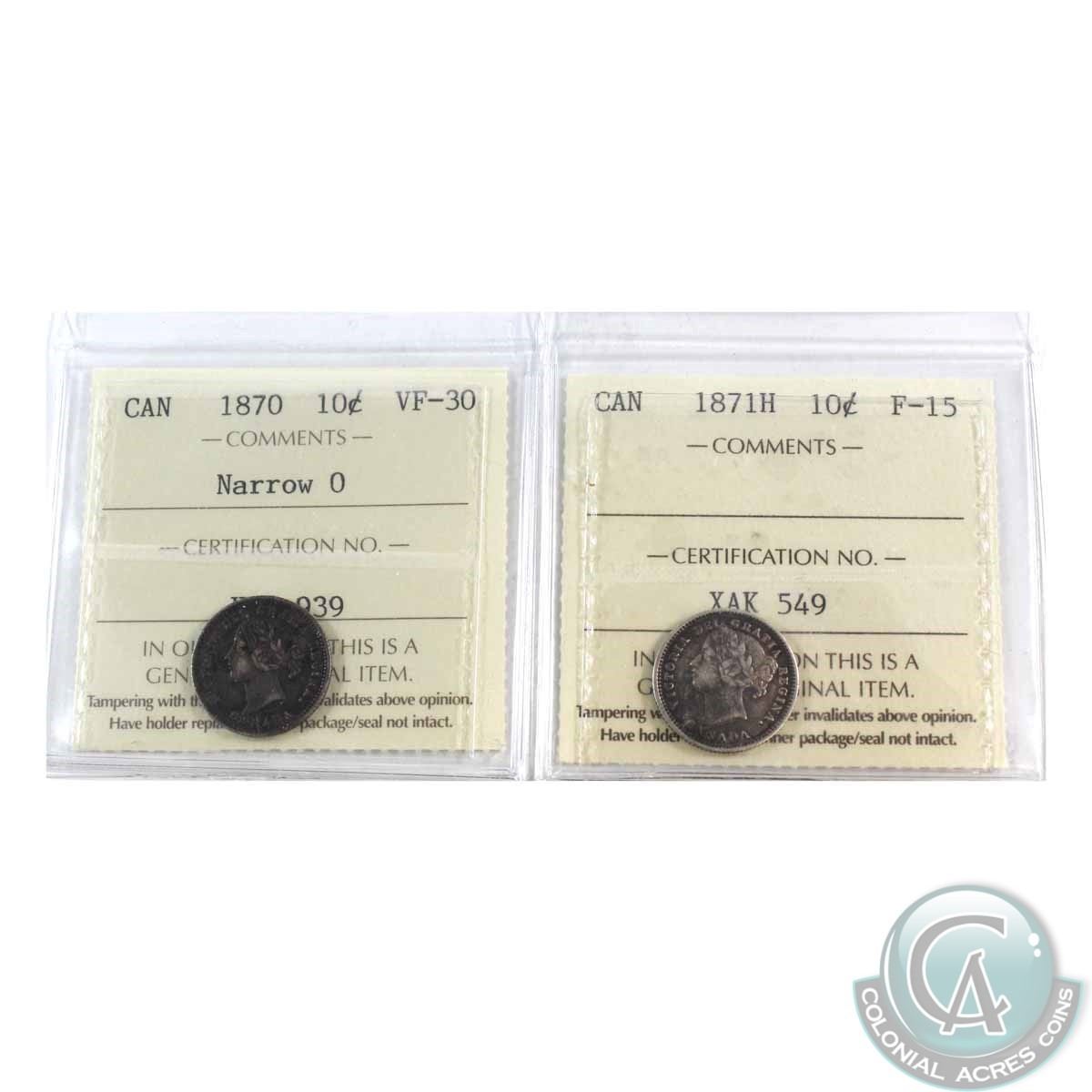 10-cent 1870 Narrow 0 ICCS Certified VF-30 & 1871H F-15. 2pcs
