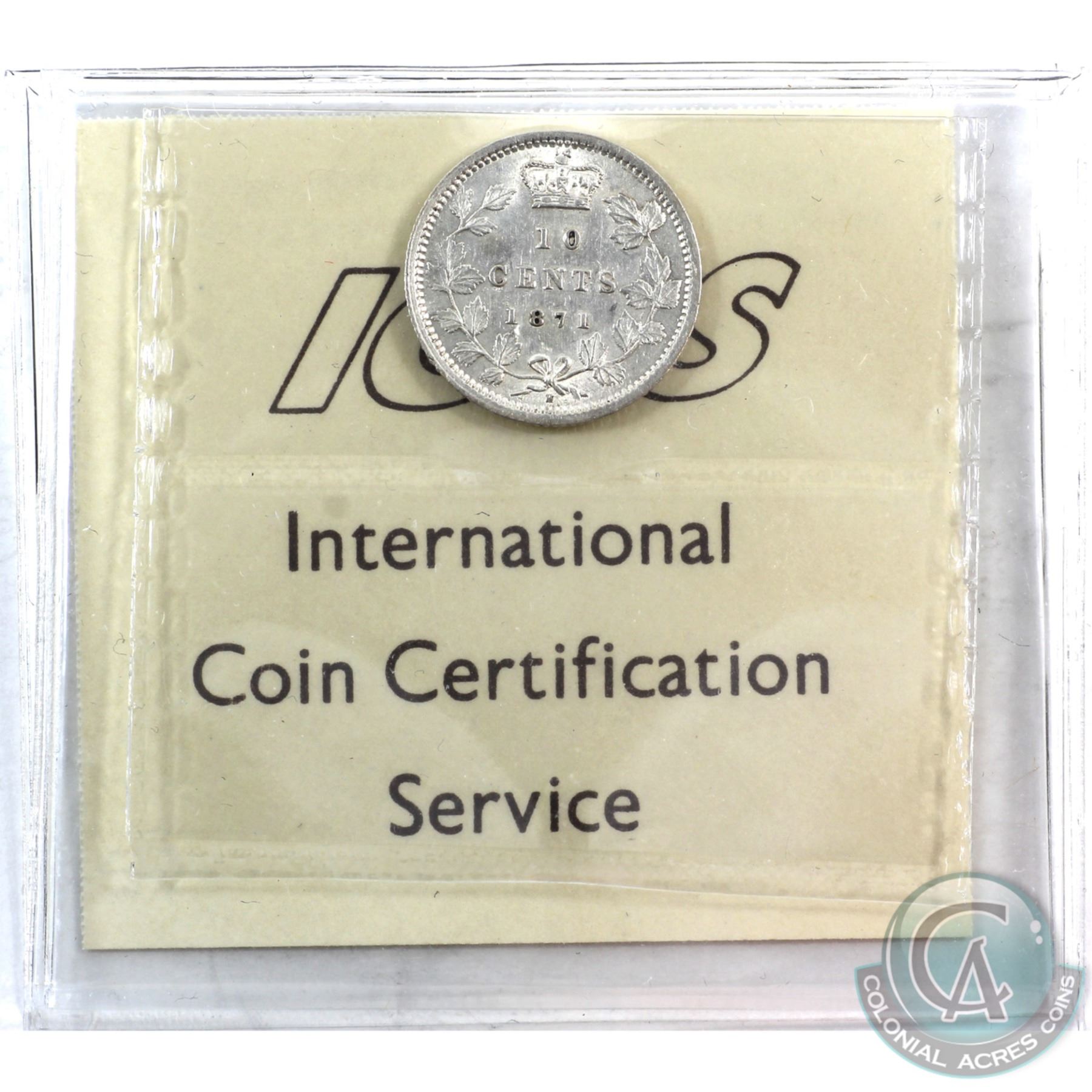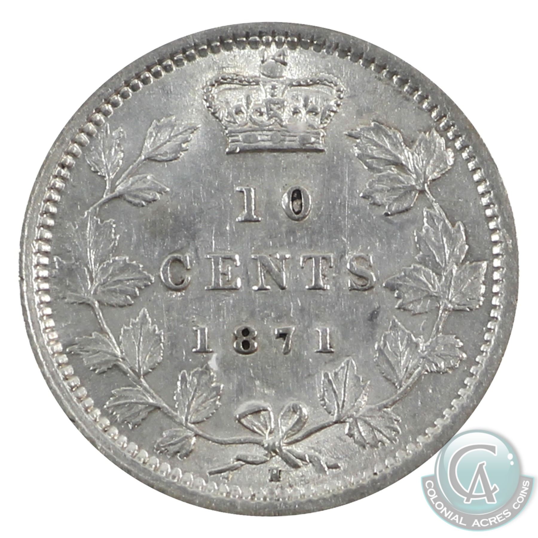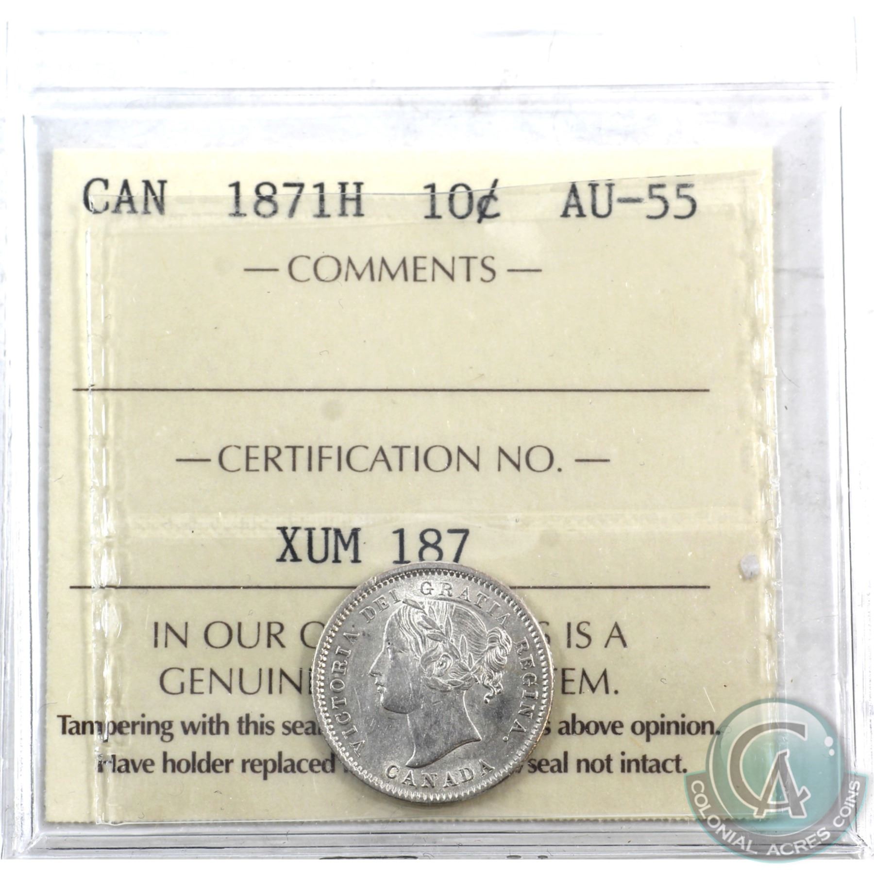 10-cent 1871H ICCS Certified AU-55. A bright coin with some minor die cracks on the obverse and some slight doubling on some letters. Worth a good look.
