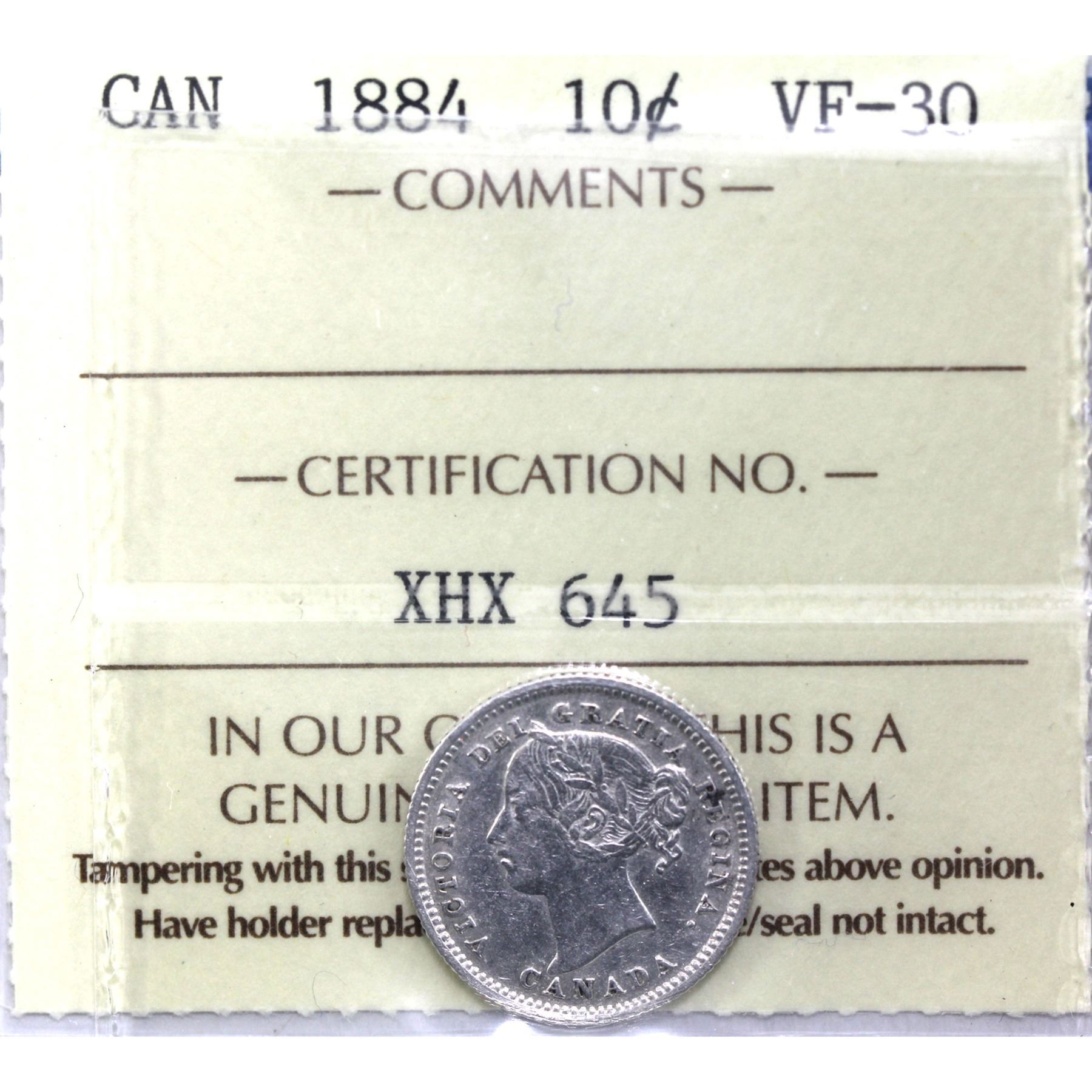 10-cent 1884 ICCS Certified VF-30 *KEY DATE, A nice mid grade example of this highly sought after Victorian silver 10-cent.