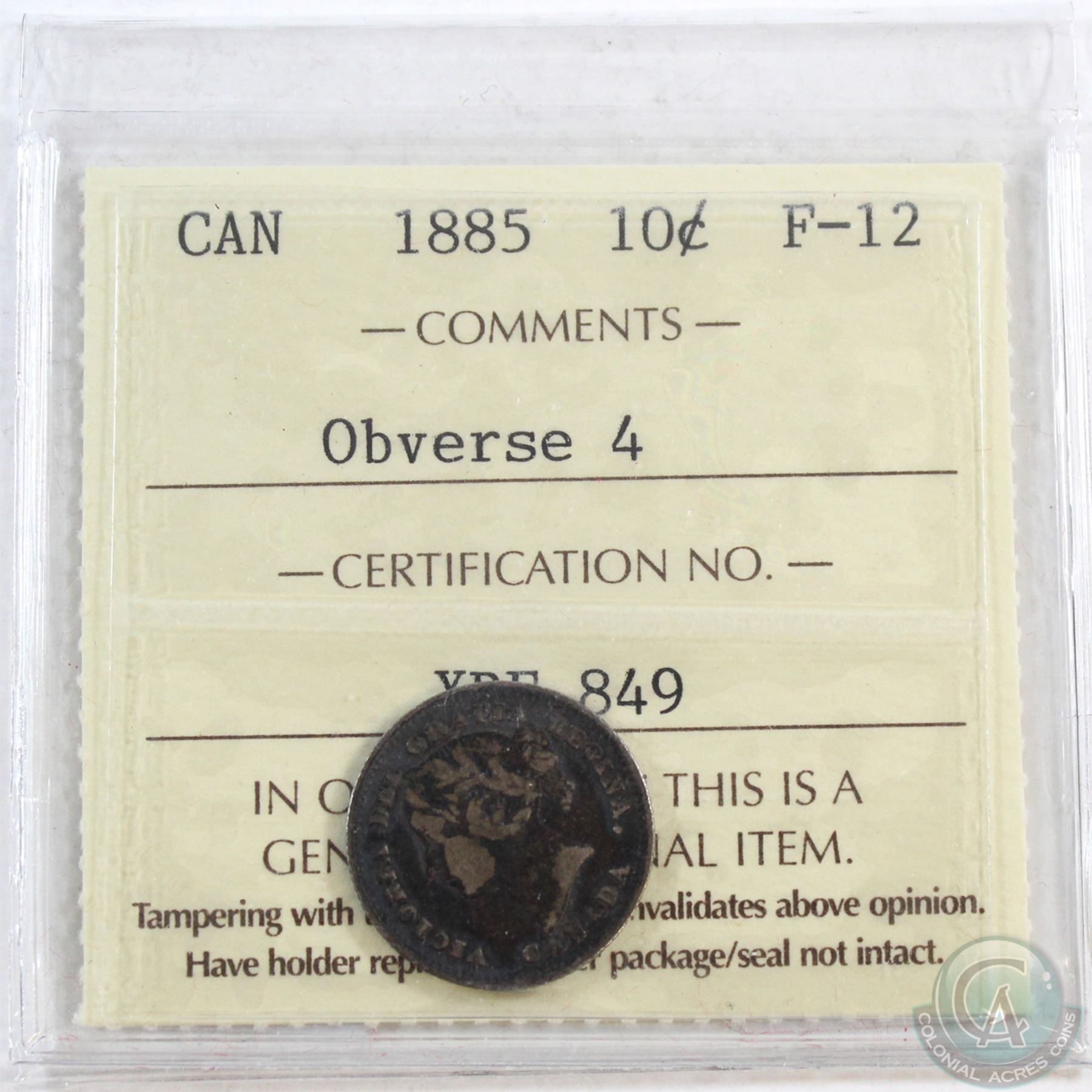 10-cent 1885 Obverse 4 ICCS Certified F-12