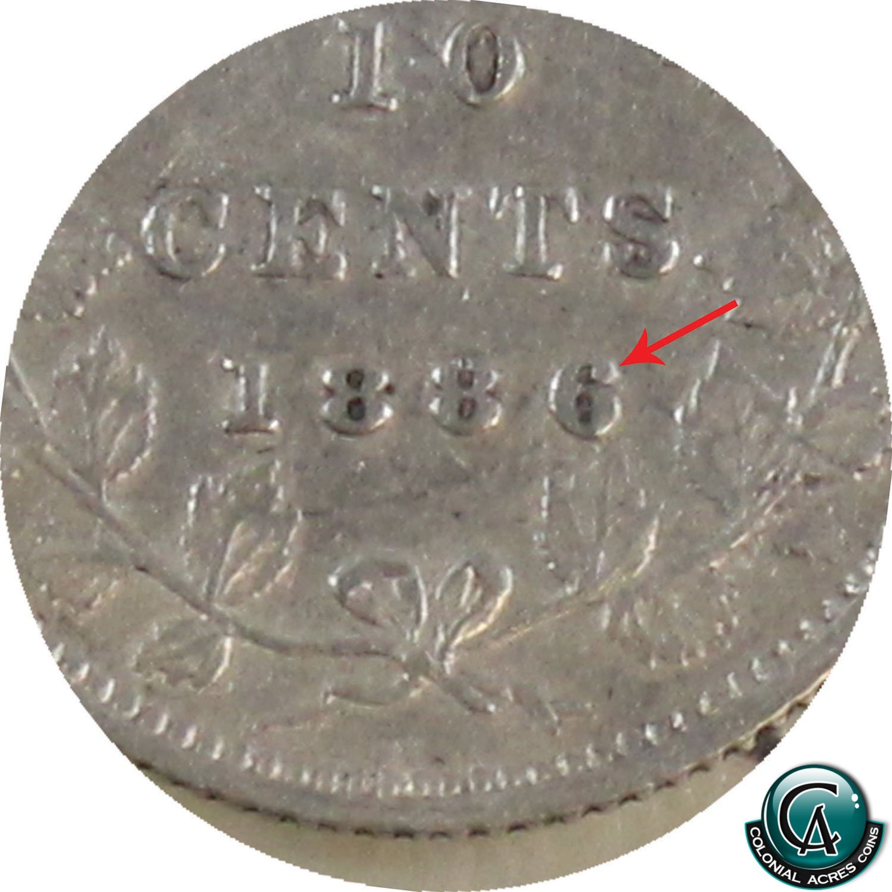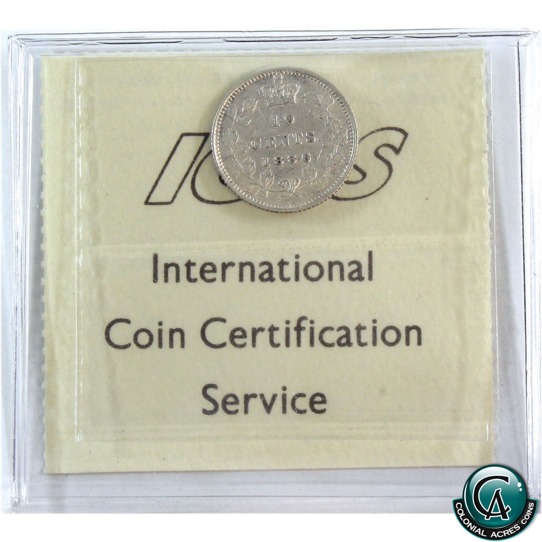 10-cent 1886 Large Knob 6 Obverse 5 ICCS Certified VF-30.