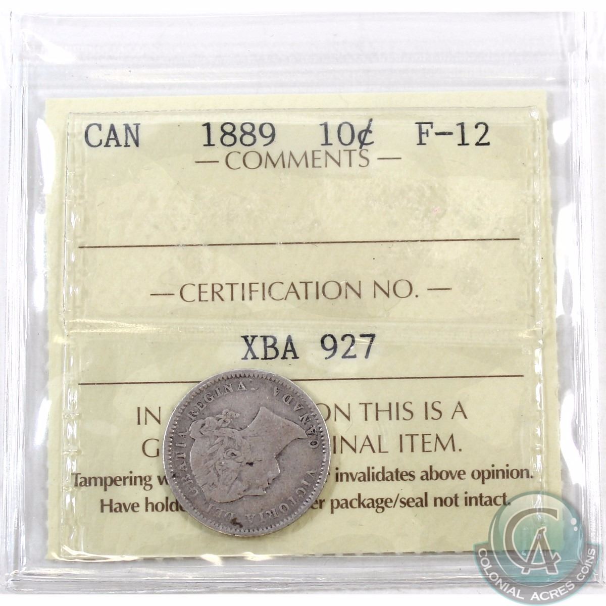 10-cent 1889 ICCS F-12 *KEY DATE* Highly sought after date, this coin features soft grey fields with consistent details on both obverse and reverse.