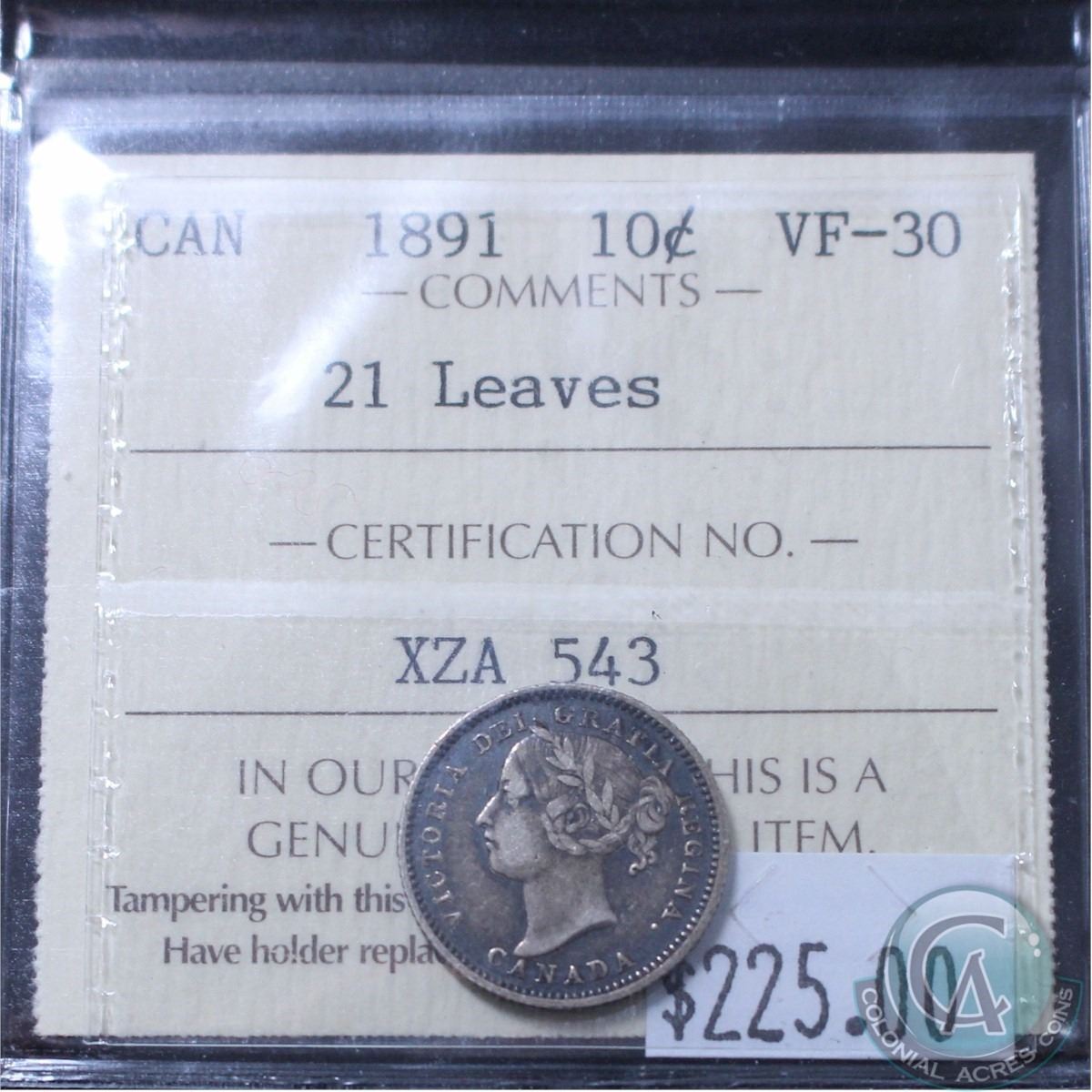 10-cent 1891 21 Leaves ICCS Certified VF-30