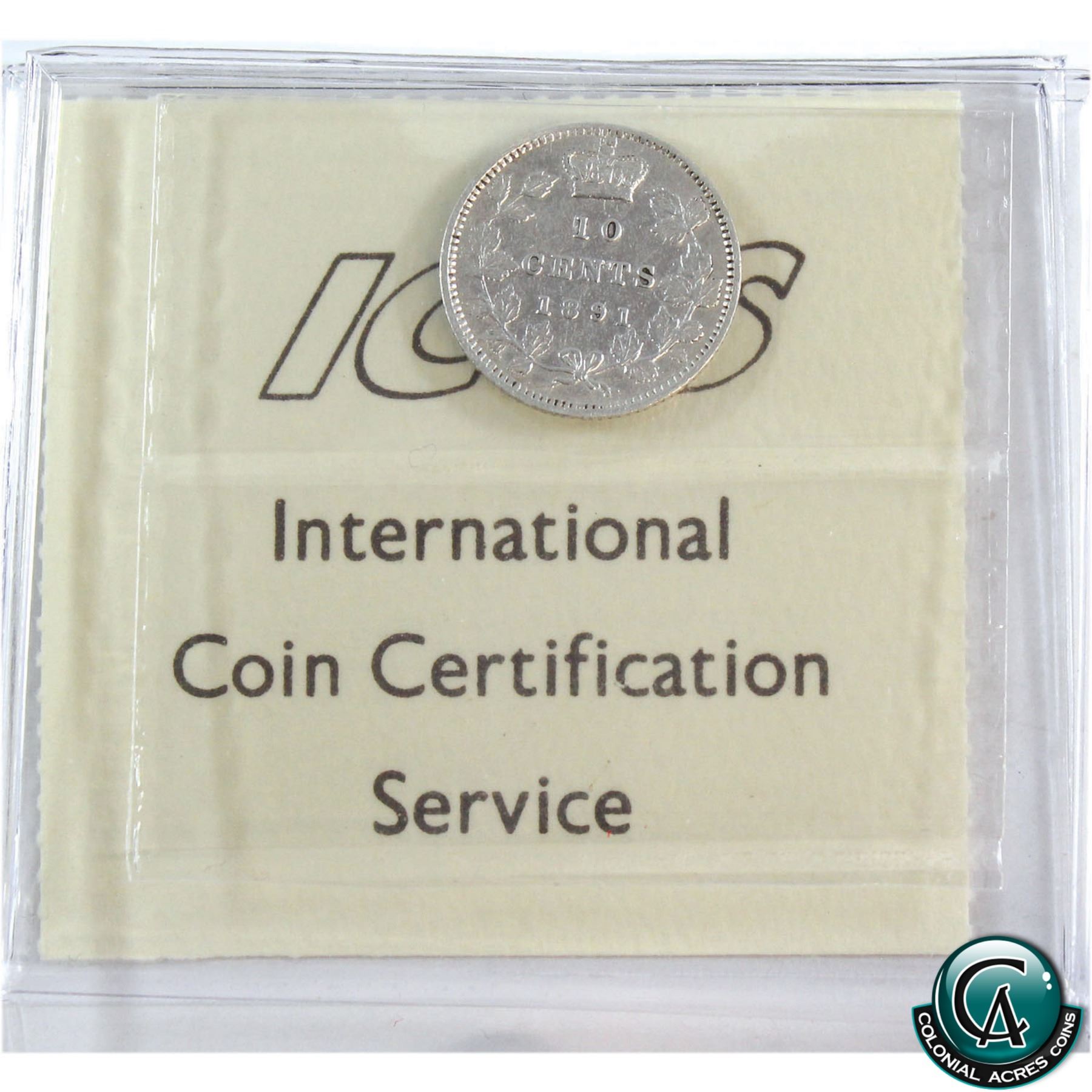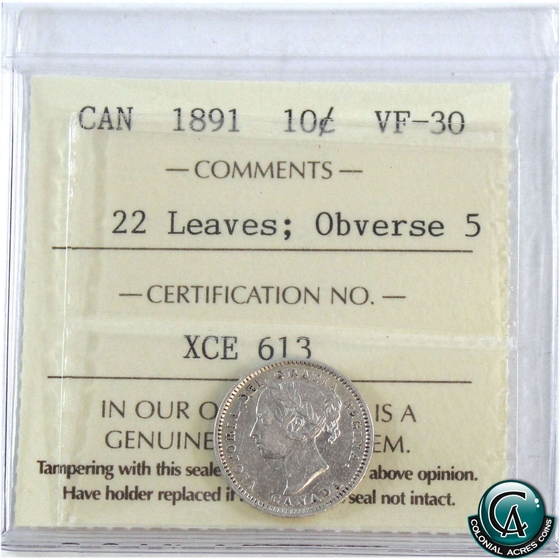 10-cent 1891 22 Leaves Obverse 5 ICCS Certified VF-30.