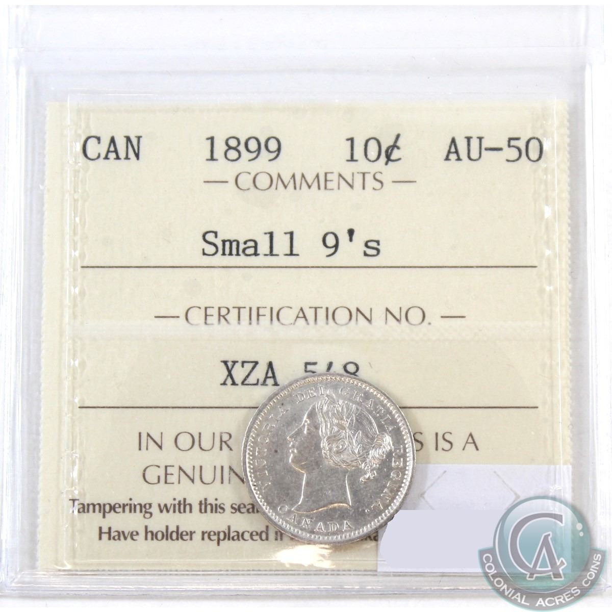10-cent 1899 Small 9s ICCS Certified AU-50. Attractive bright coin.