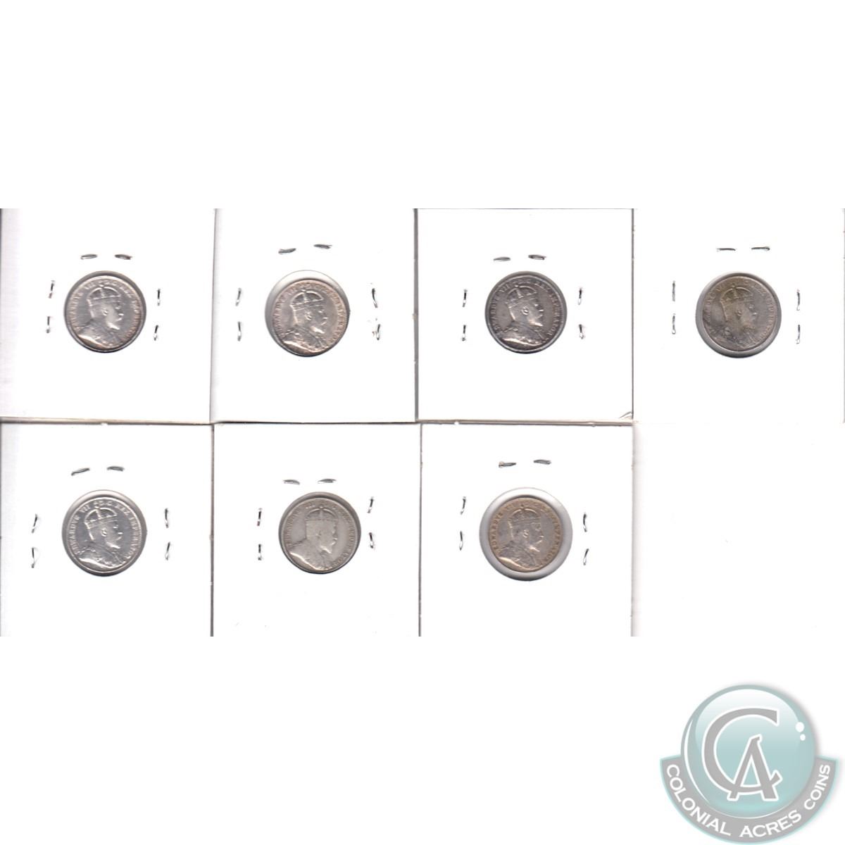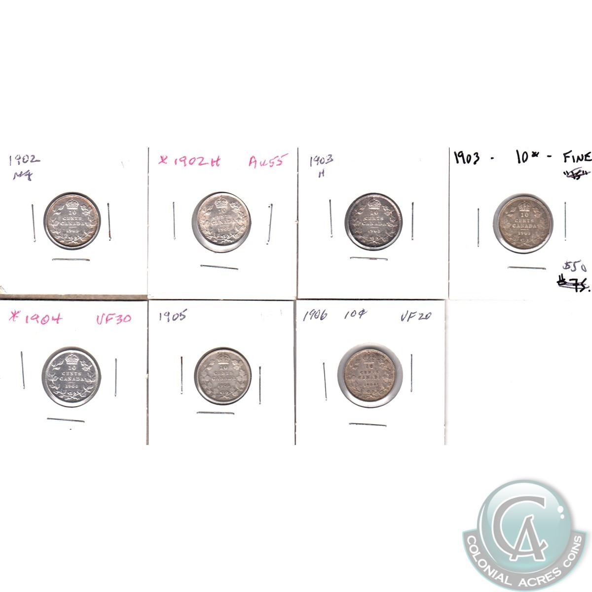 10-cent 1902 F-VF, 1902H AU-UNC, 1903H VF, 1903 Fine, 1904 VF-EF, 1905 VG-F, 1906 VF. 7pcs