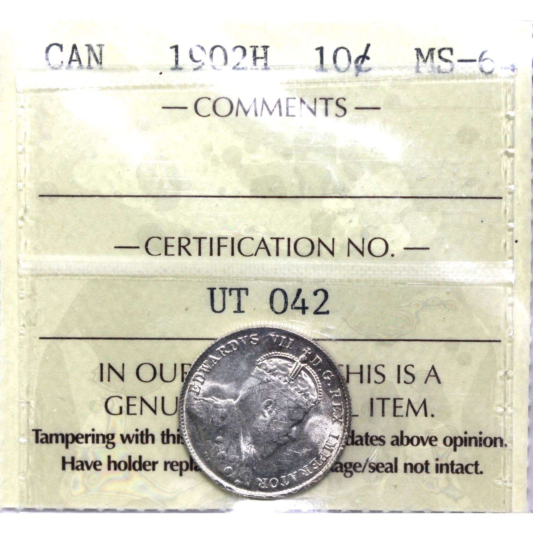 10-cent 1902H ICCS Certified MS-64. A stunning coin with blasted white finish throughout and just light hints of edge toning. Coin has eye appeal of MS-65+!