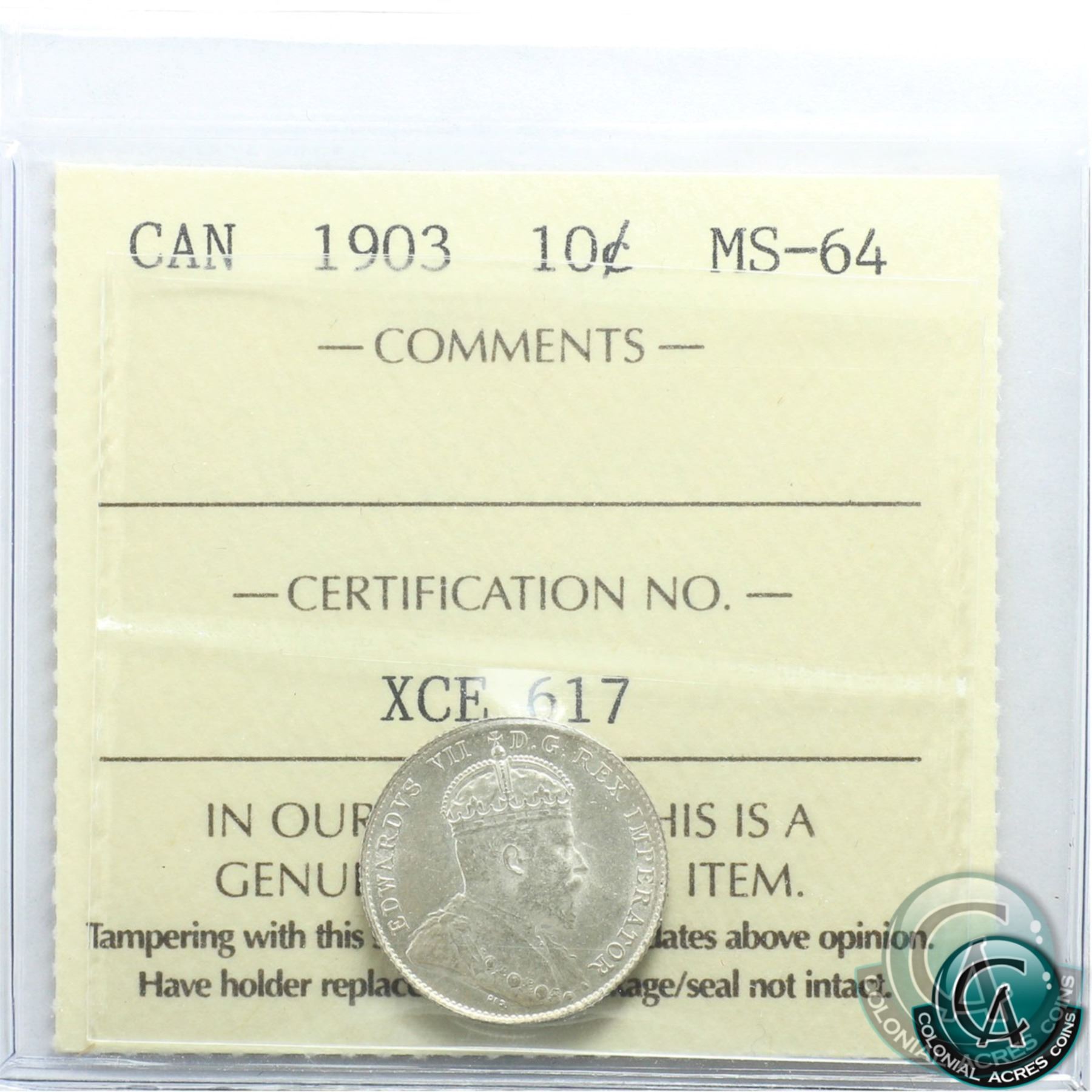 10-cent 1903 ICCS Certified MS-64. An attractive coin with great eye appeal.