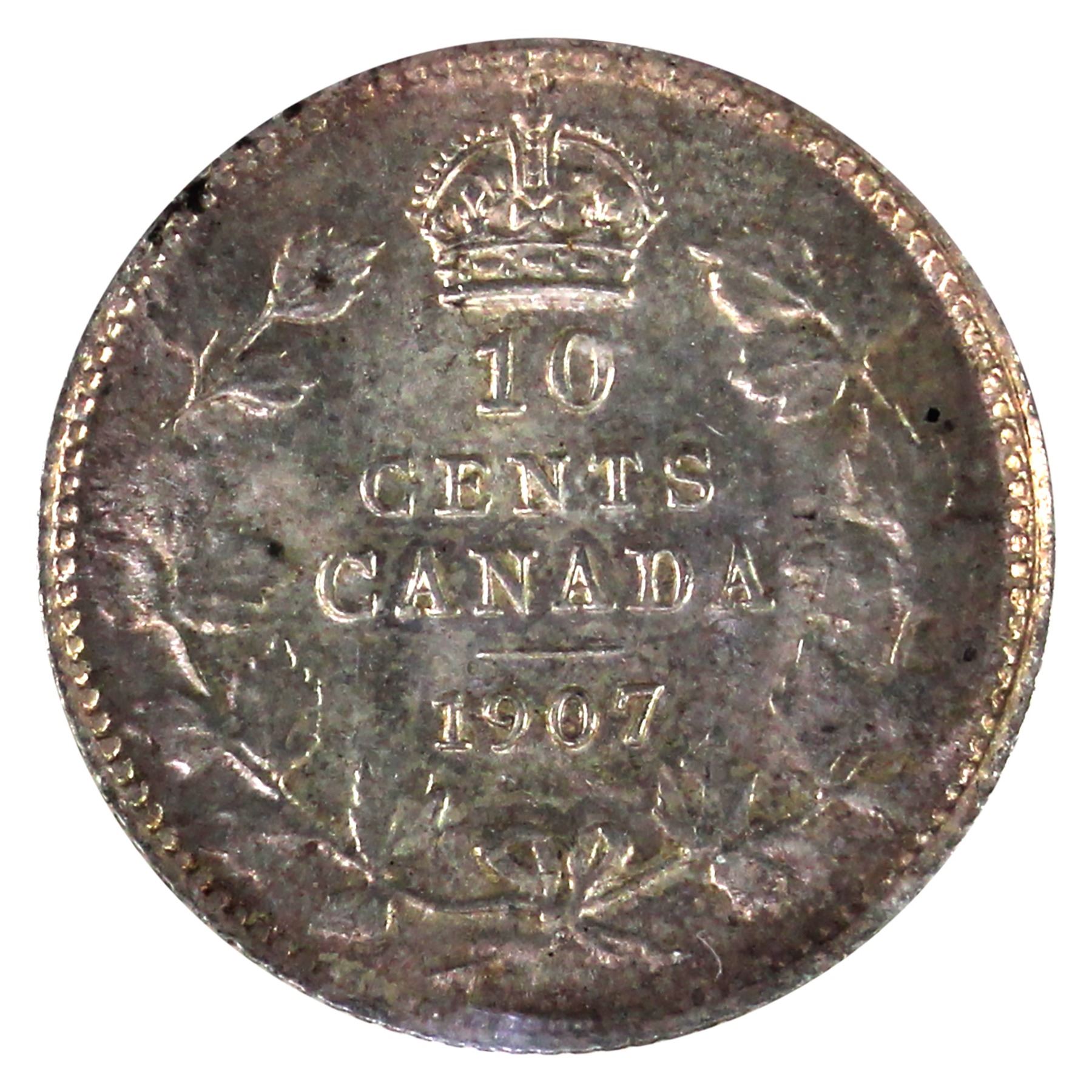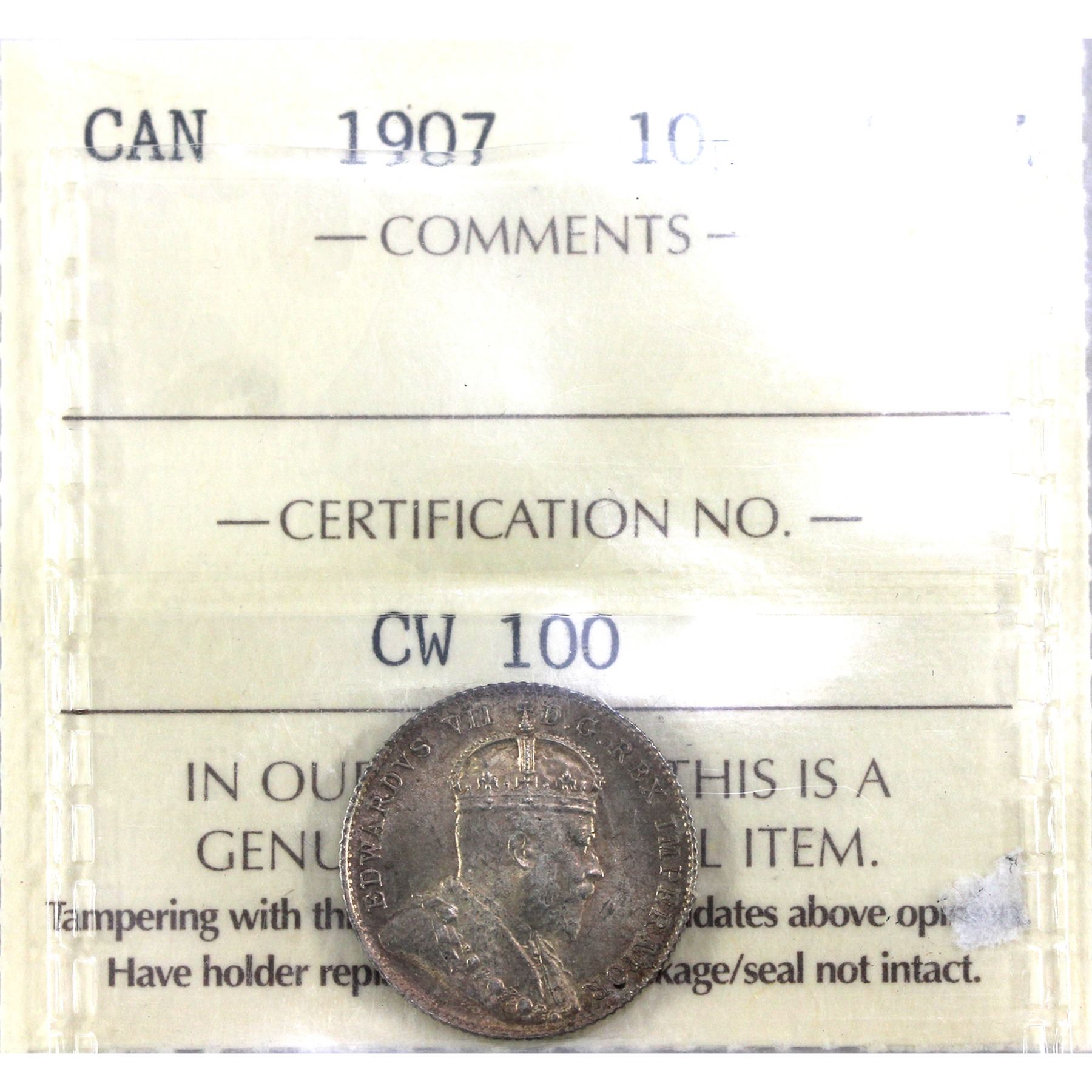 10-cent 1907 ICCS Certified MS64. Flashy coin with soft rose tones.