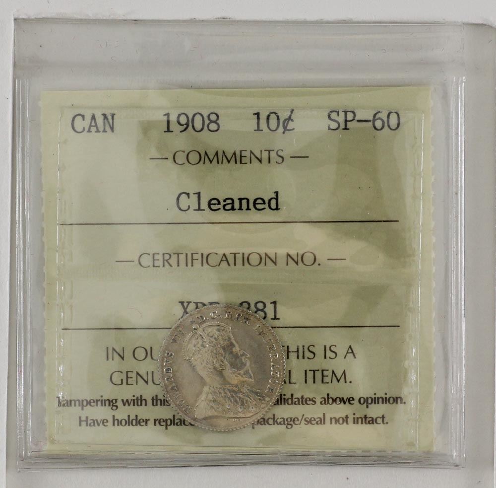 10-cent 1908 ICCS certified SP60 Cleaned. An attractive bright coin that has been polished.
