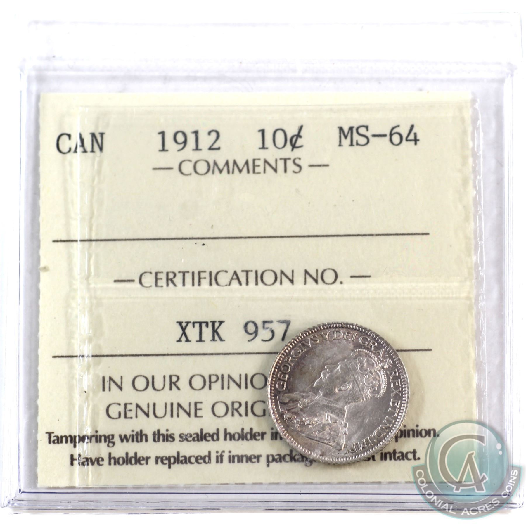 10-cent 1912 ICCS Certified MS-64. A strong strike coin with near white fields reverse shows as a superior grade!